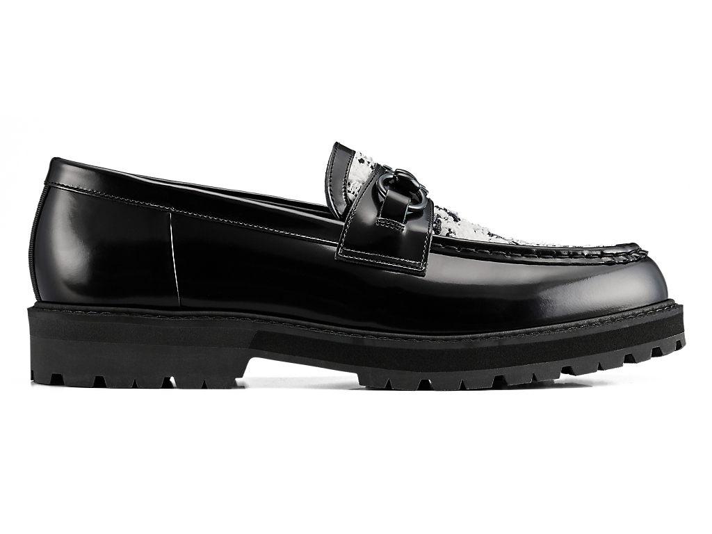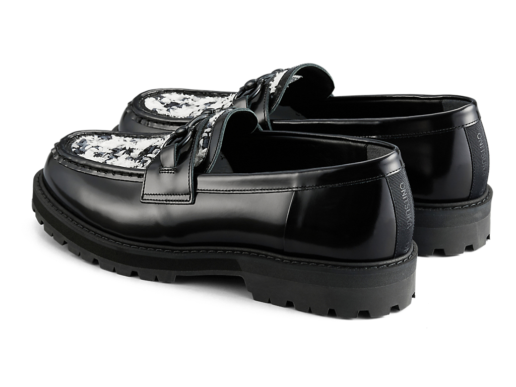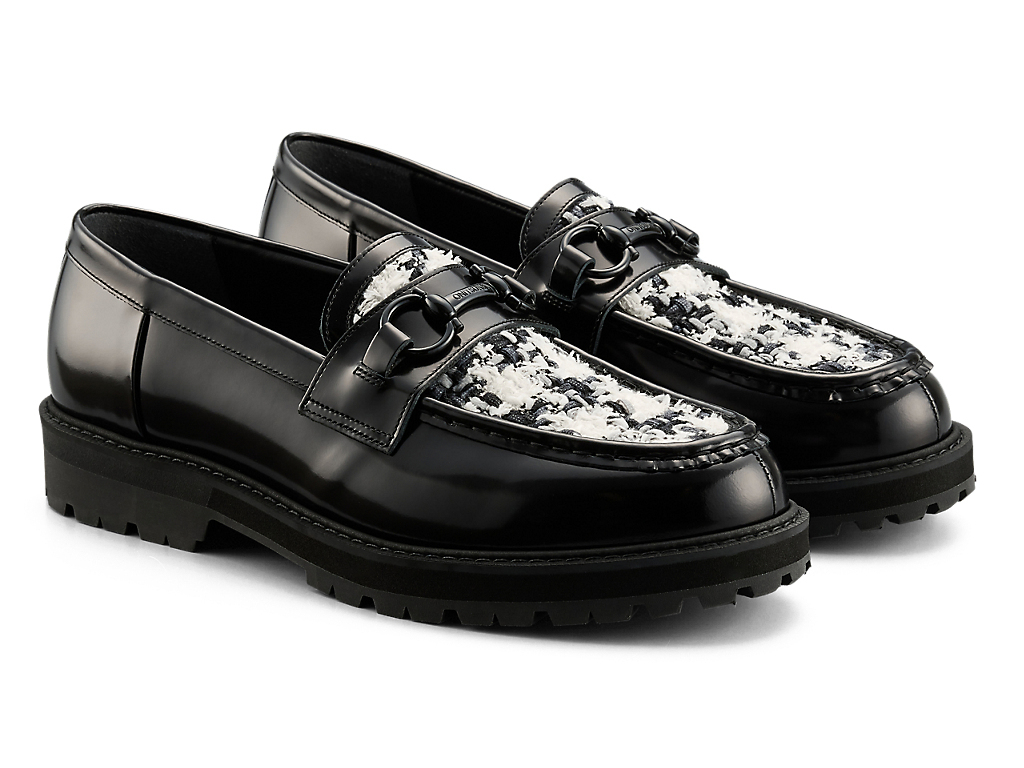 アッパーには、日本の神戸牛レザーを使用し、フラットで光沢感のあるガラスレザーが足元を華やかに演出します。また、岩手県で織られたツイードを取り入れ、太糸や細糸、天然繊維と人工繊維が織り成す立体的なテクスチャーが上品なアクセントを添えます。