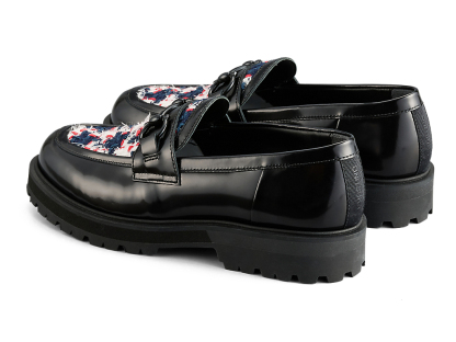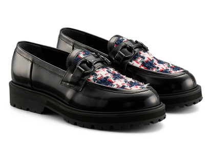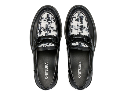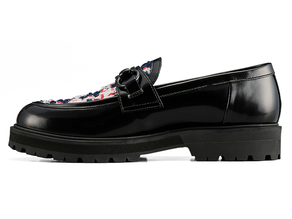 アッパーには、日本の神戸牛レザーを使用し、フラットで光沢感のあるガラスレザーが足元を華やかに演出します。また、岩手県で織られたツイードを取り入れ、太糸や細糸、天然繊維と人工繊維が織り成す立体的なテクスチャーが上品なアクセントを添えます。