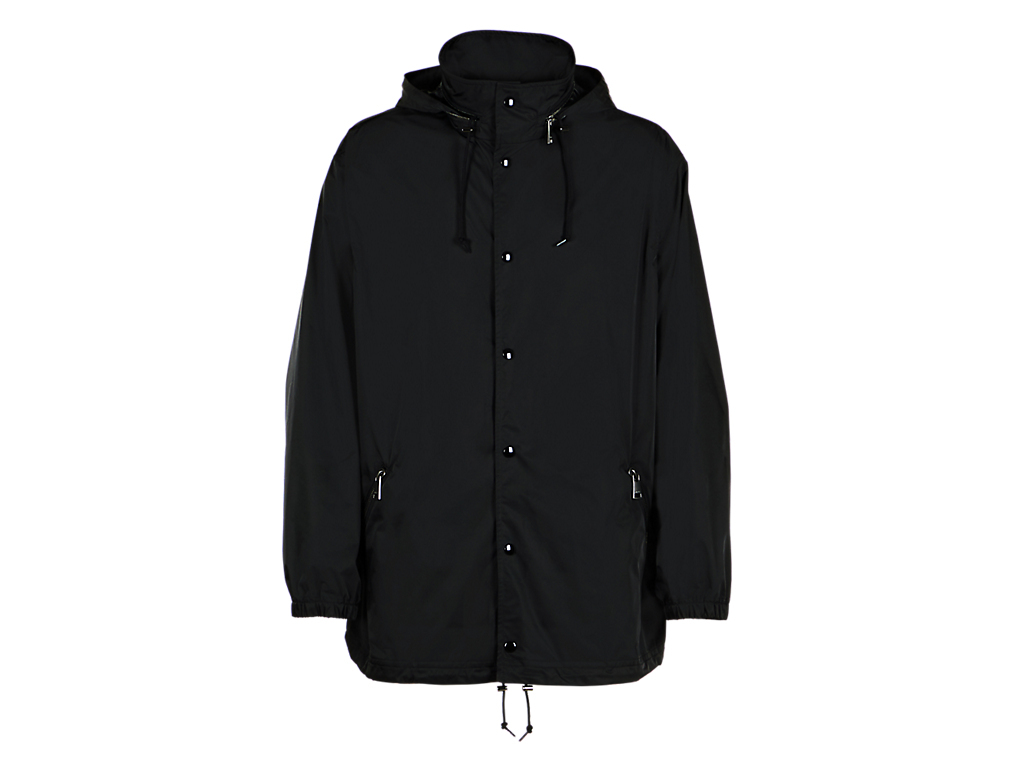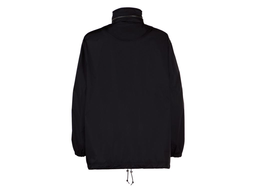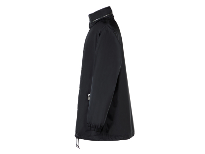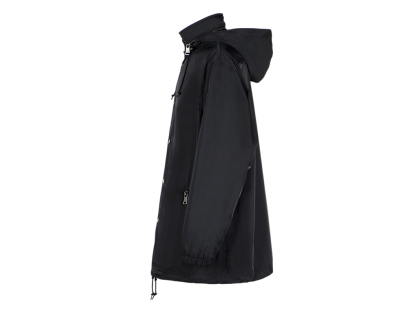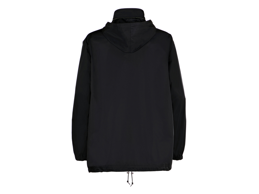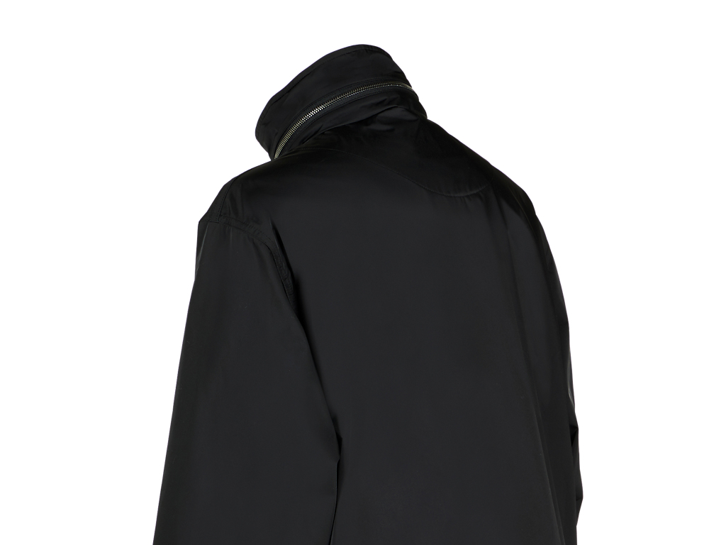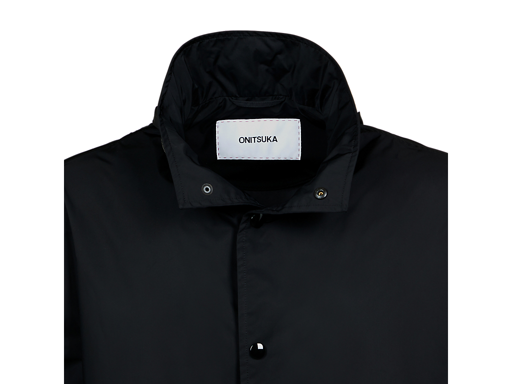 シルエットにこだわったフード付きブルゾン。フードはスタンドカラーの部分に収納できる仕様になっています。裾にかけて微妙にテーパードしており、クリーンでスッキリしたシルエットに仕上げています。表地には、やや厚手のハリコシもありつつ、しなやかで光沢のある素材を使用しています。また、過フッ素化合物フリーのはっ水加工を施しているので、小雨程度の水滴であればはじきます。このアイテムは、発色性に優れたPTT繊維を使用しており、深みのある上品なTHE ONITSUKAらしい黒色を提案します。カジュアルなアイテムですが、THE ONITSUKAのドレスシューズと合わせたドレッシーな雰囲気のスタイリングにマッチするアイテムです。