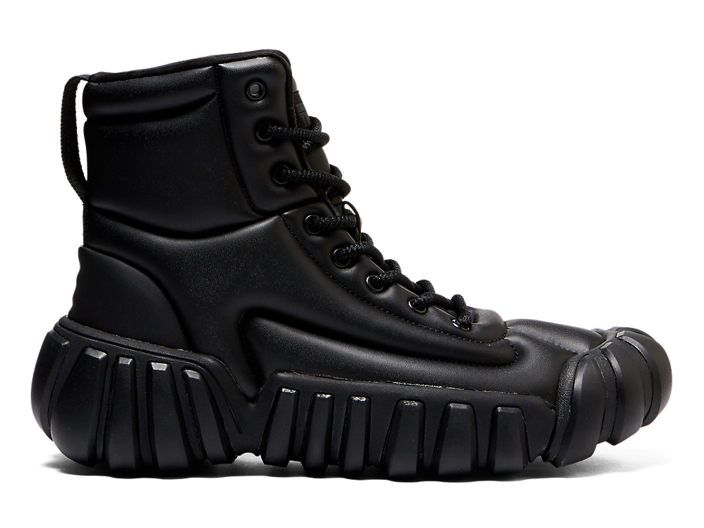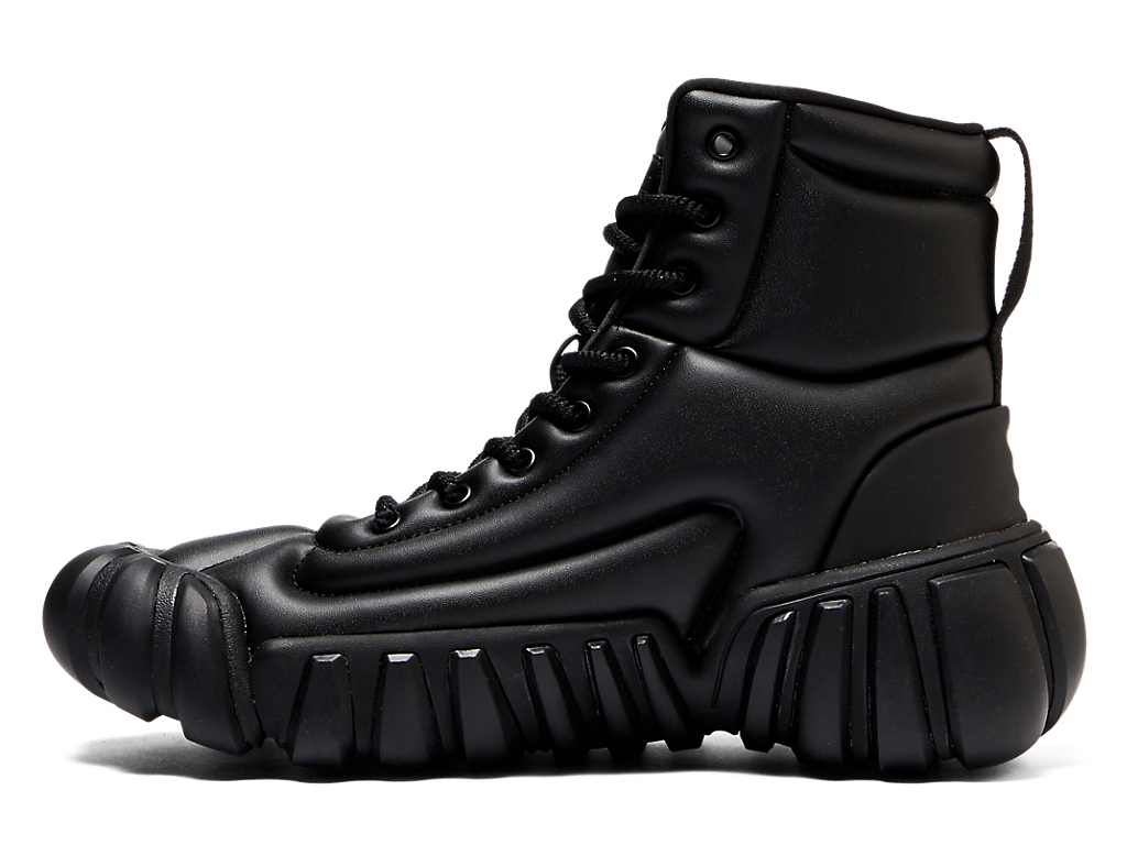 直線と曲線を用いたフォルムのアッパーには大胆にフォームを配し、足を包み込むような快適な履き心地とインパクト溢れるデザインを両立した1足。