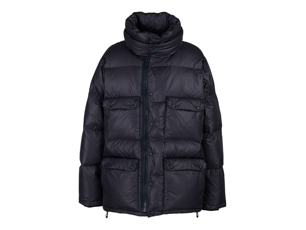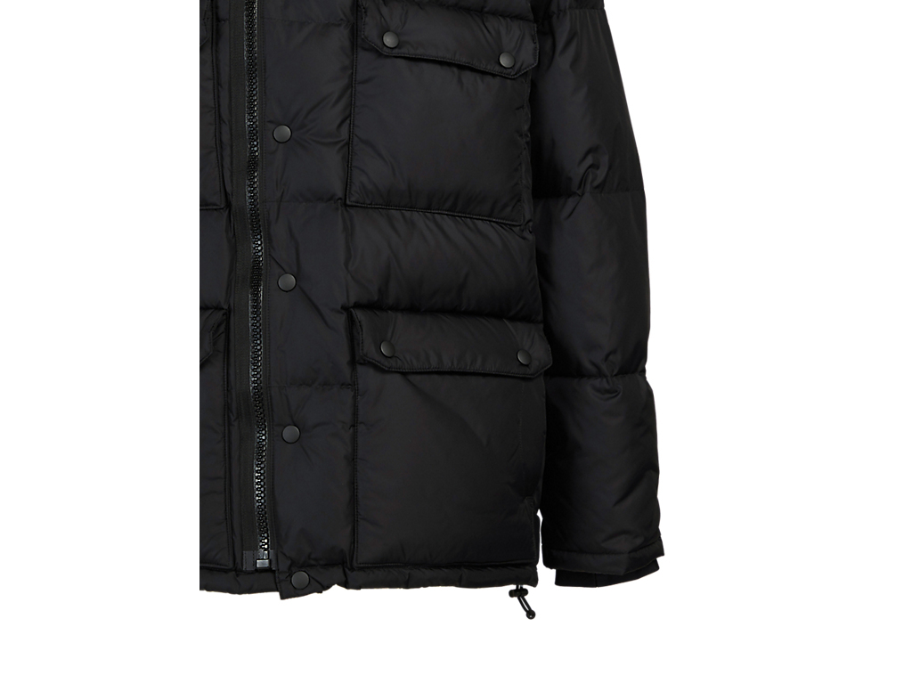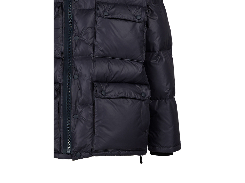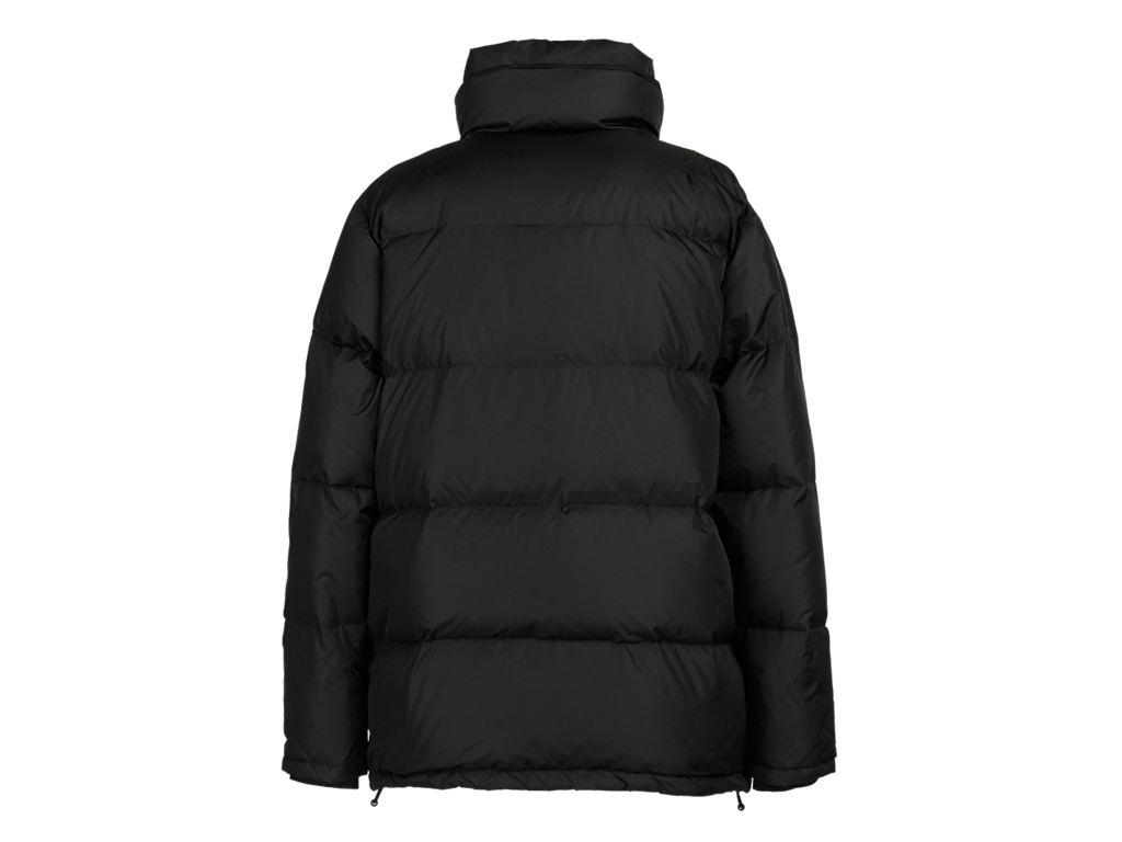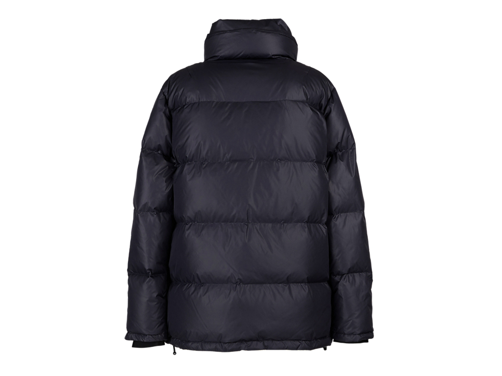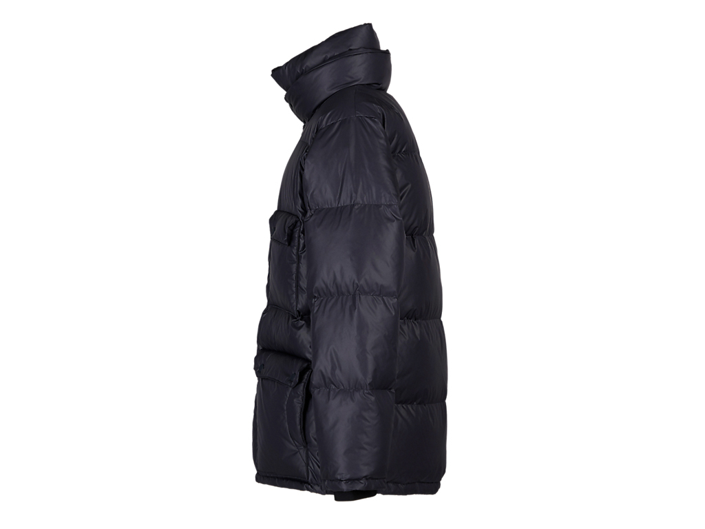 ややアシンメトリーに取り付けたファスナーとスナップボタンのディテールが印象的なデザイン性と機能性を両立したダウンジャケット。腰まで覆うミドル丈で、使用しているダウンは日本で洗浄された高品質な軽さとボリューム感が特徴の750フィルパワーのホワイトダックダウン。フラップ付のポケットは南極観測隊が着用しているジャケットと同仕様で、雪がポケット内に入りにくい構造になっている本格派なつくりに。左右からも手を入れられる構造なのも寒さ対策になり魅力的。更に内ポケットも左右に存在するため、収納力にも長け、実用性も兼ねそろえています。袖口にはカフスゲーターも付いていて風の侵入を抑えます。表地には高級感あるセーレン(株)製のリサイクルナイロンを使用。