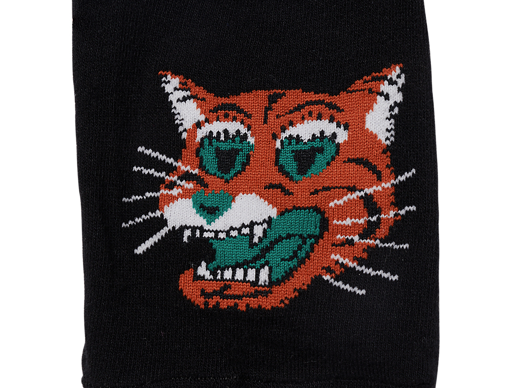 左右でカラーが異なるユーモラスな虎がコーデに遊びをプラスしてくれる。
