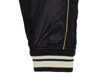 しなやかなナイロン素材をボディに採用し、ラグランスリーブの切り替えに両端ゴールドのパイピングを配置。襟元、袖口、裾のオリジナルストライプが全体を引き締める洗練されたデザイン。