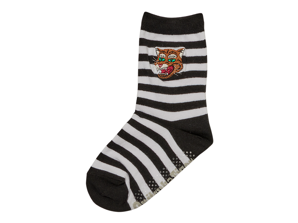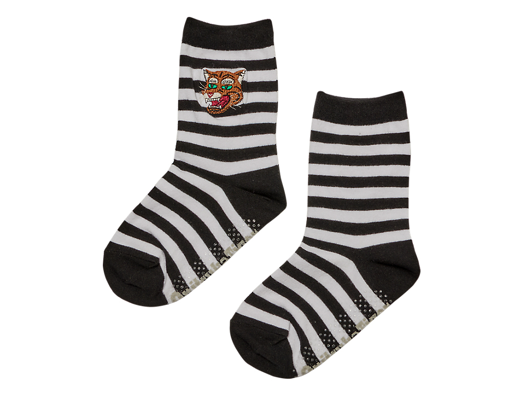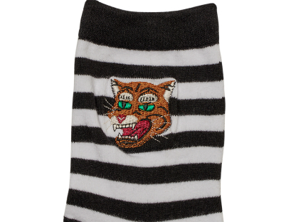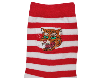 均等なボーダーデザインにカラフルな虎の刺繍をワンポイントで配置。