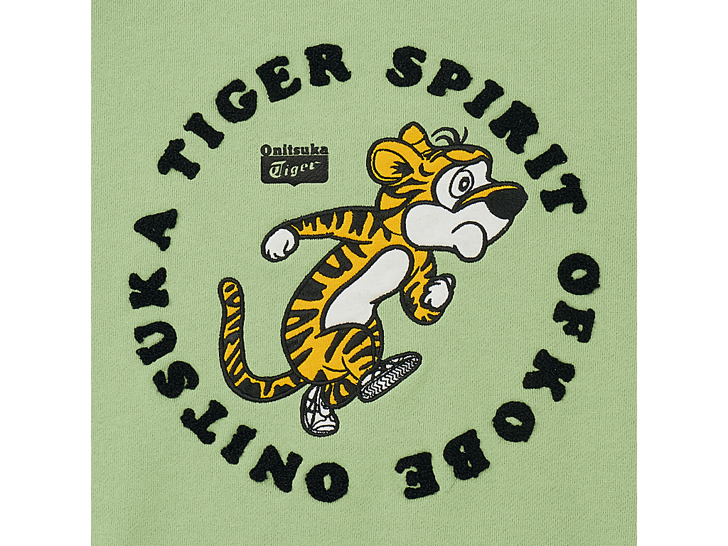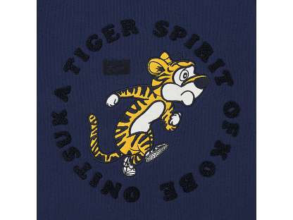 ロゴにはラバープリント、円を描くようにデザインされたメッセージには独特な風合いと立体感を楽しめるサガラ刺繍、そしてメインの虎にはワッペン風の立体刺繍と、3種類のテクニックをミックスした、ディテールにこだわったアイテム。