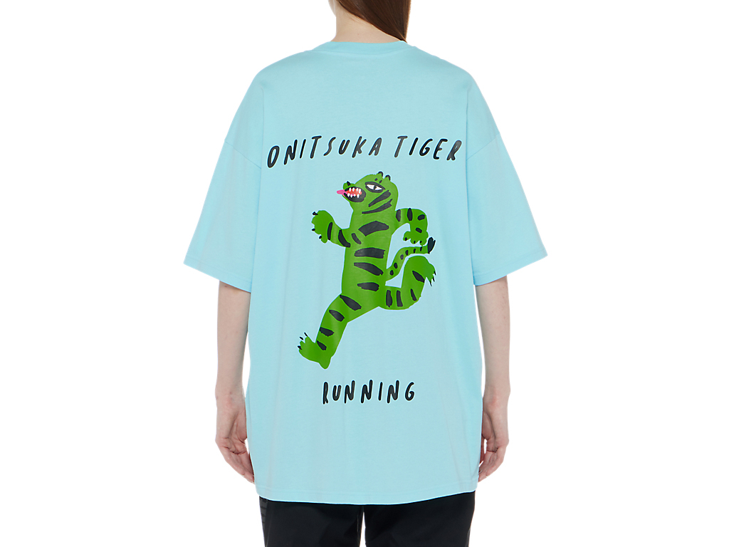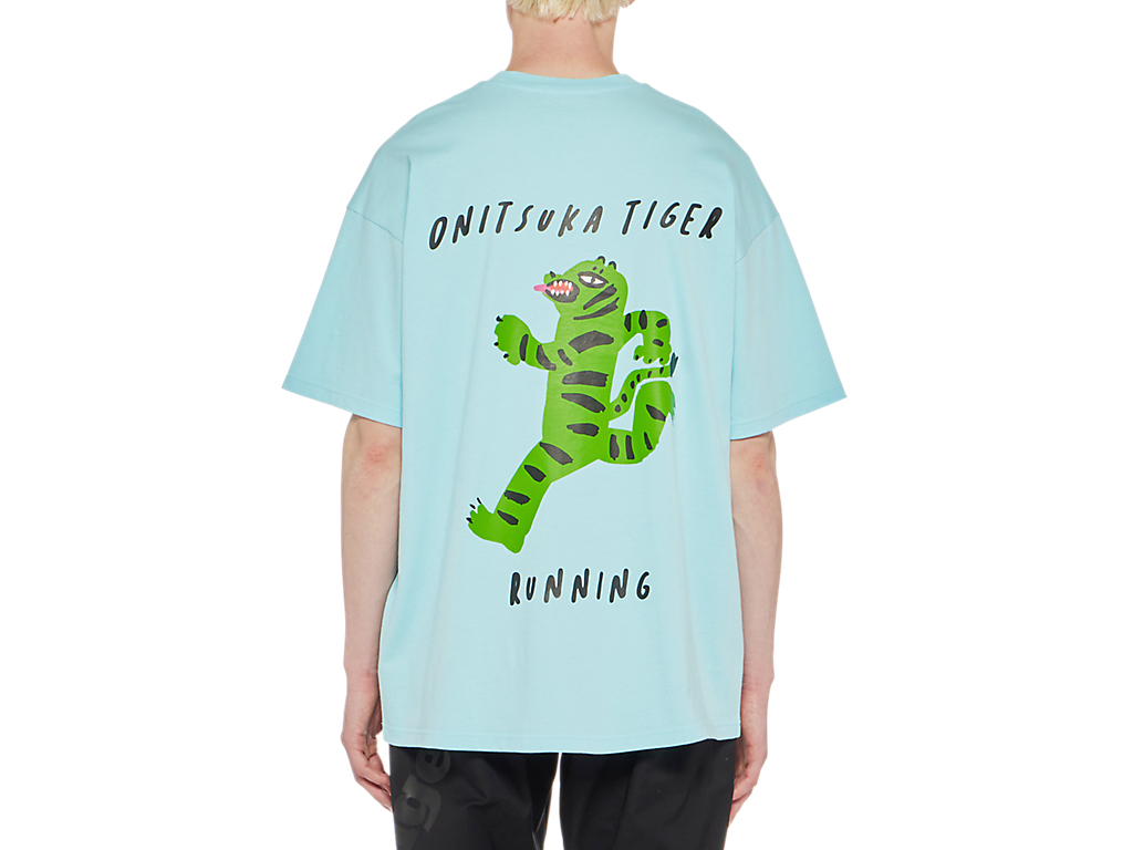ランニングしているキュートな虎のバックプリントが特徴の半袖Tシャツ。