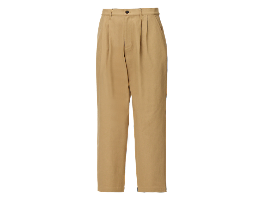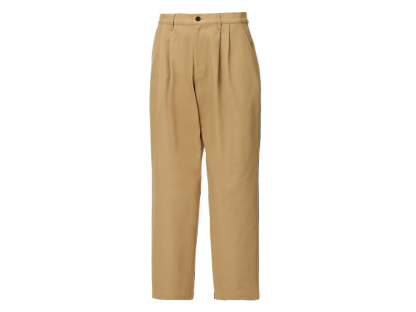 ゆったりとしたワイドシルエットのパンツ。フロントにタックを配置し、動きやすさも考慮。