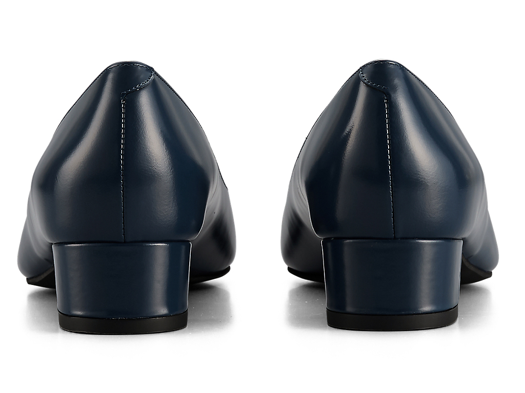 光沢感のある日本製のレザーを使用したアーモンドトゥのデザインを、3cmのローヒールで仕上げている。
