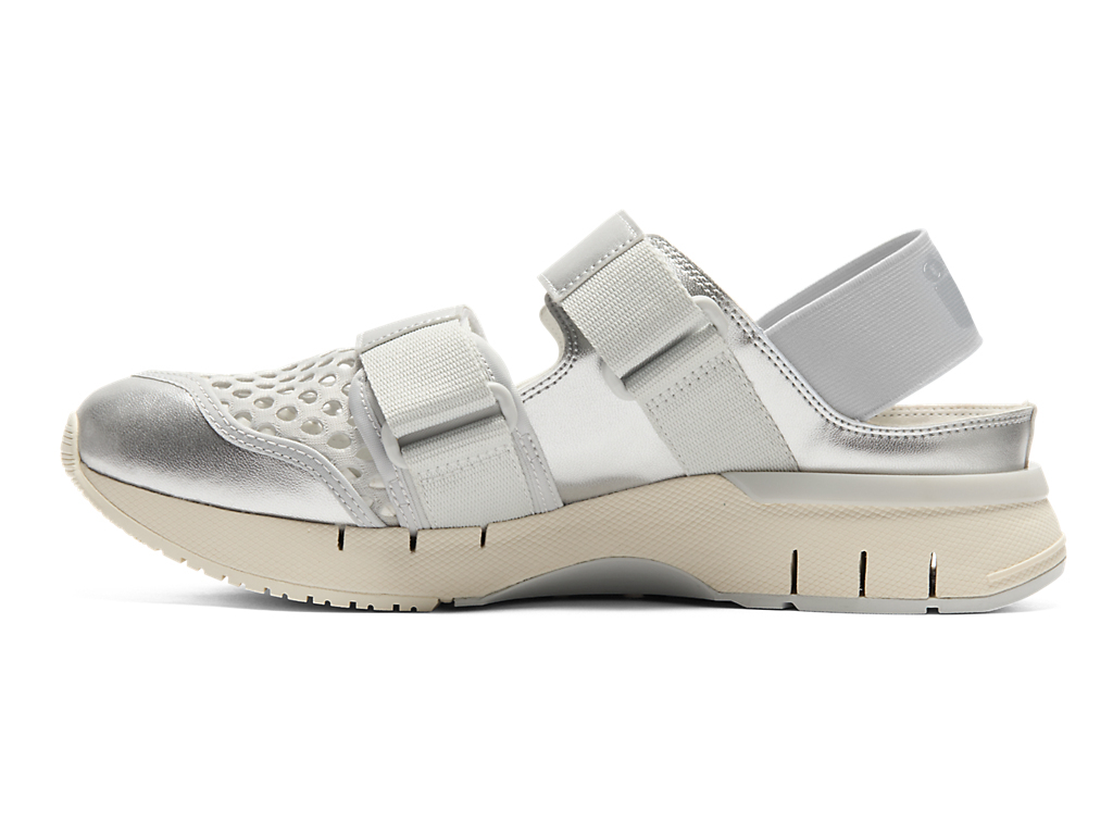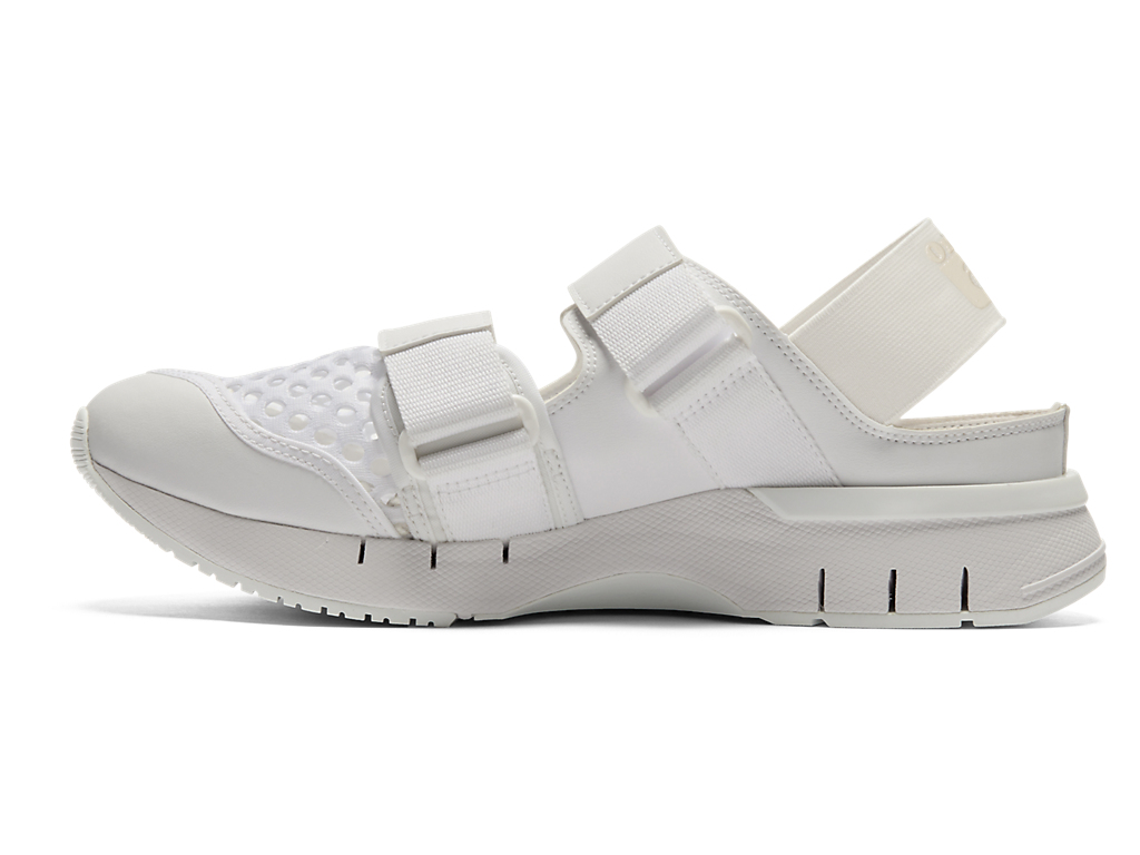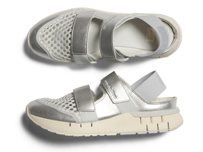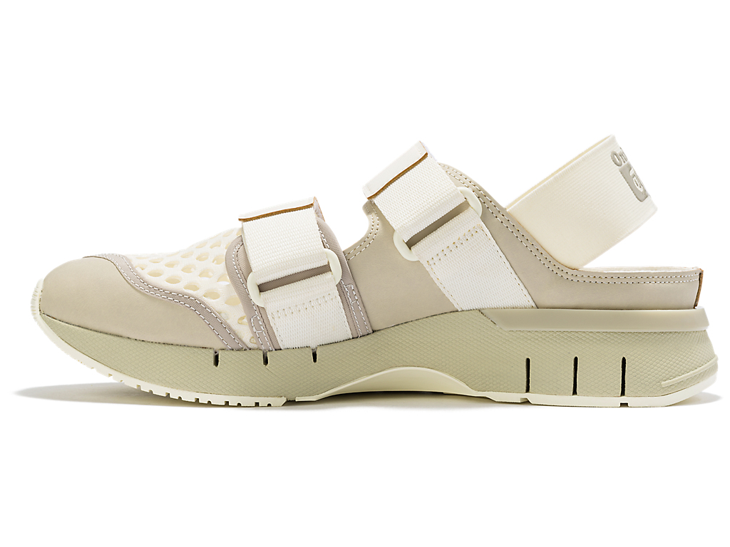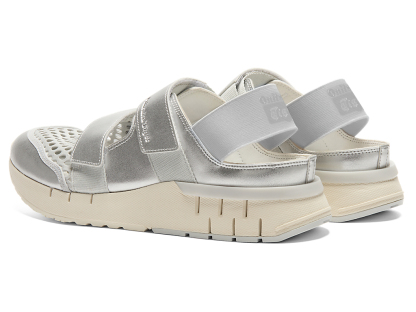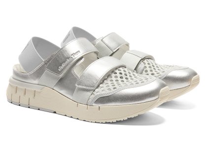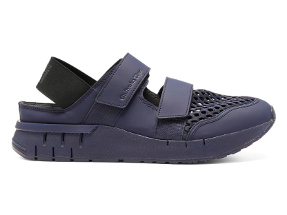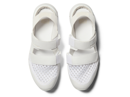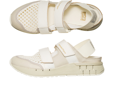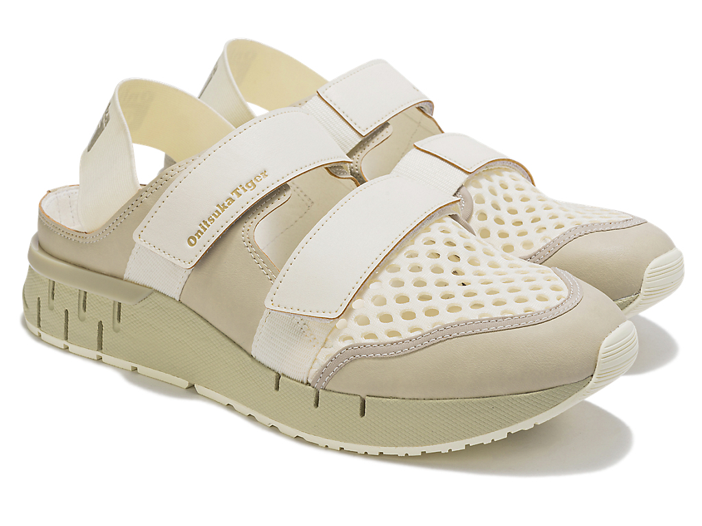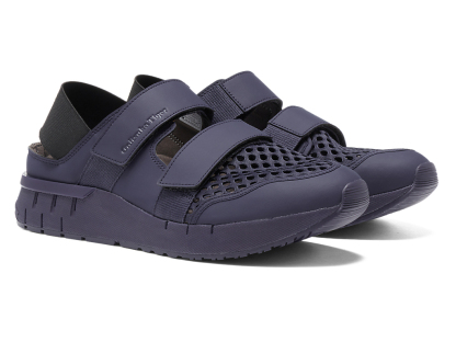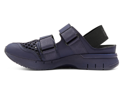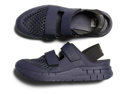 涼しげな印象を与えるオープンメッシュでつま先部分を覆っており、さまざまなシーンでスタイリングできるのが特徴。また、面ファスナーのベルトやかかと部のエラスティックバンドによって、フィッティングの調節と簡単な着脱を可能にしている。