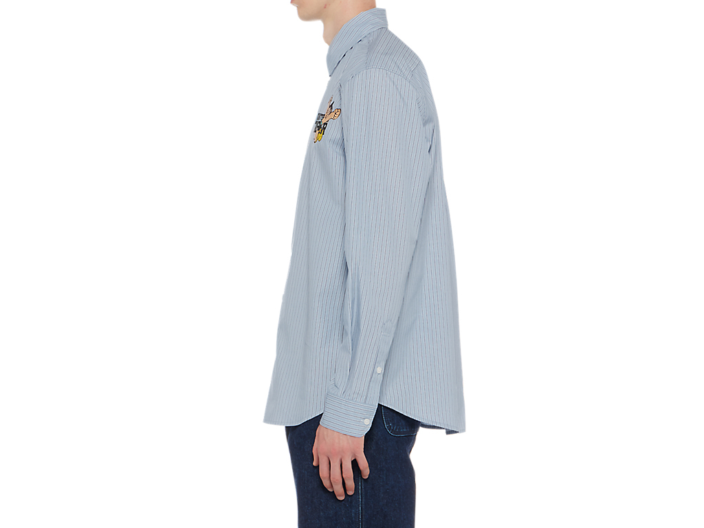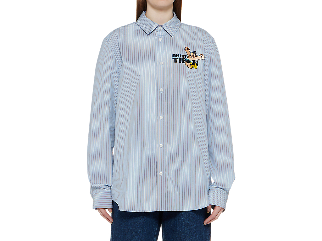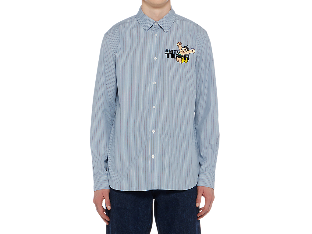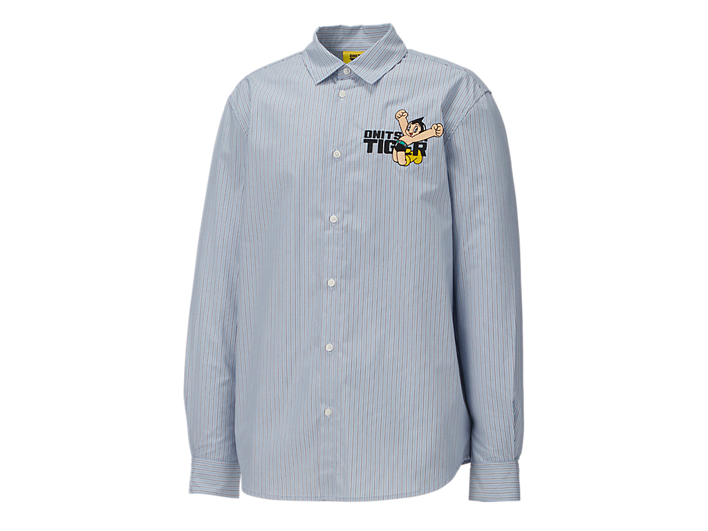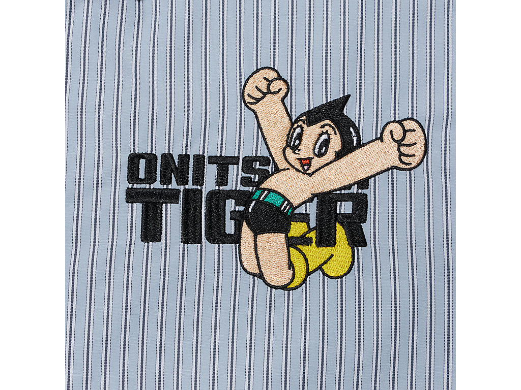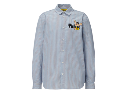 シンプルでクラシックなストライプ柄のシャツ。左胸には、鉄腕アトムとブランドロゴが組み合わさった刺繍が施されており、アトムの赤いブーツがブランドのアイコニックカラーのタイガーイエローに。