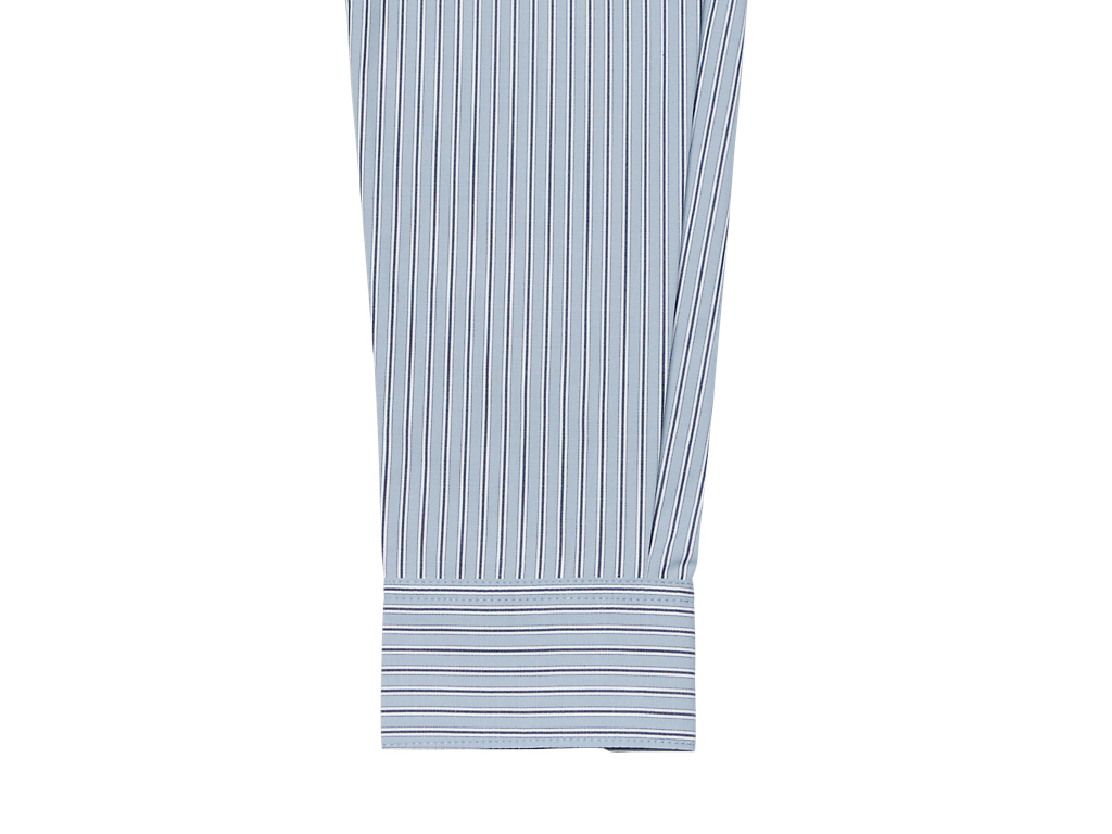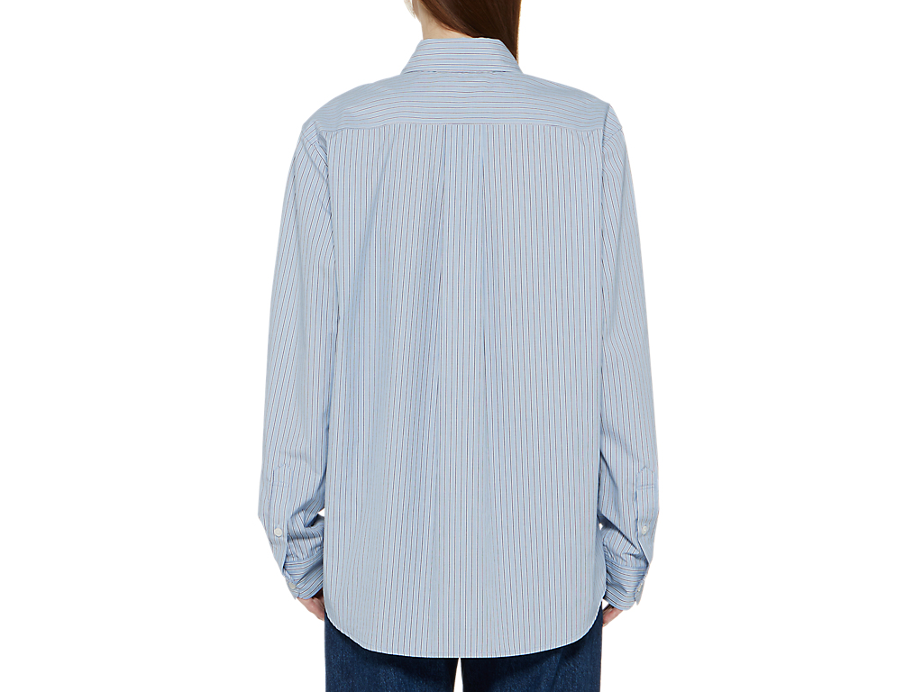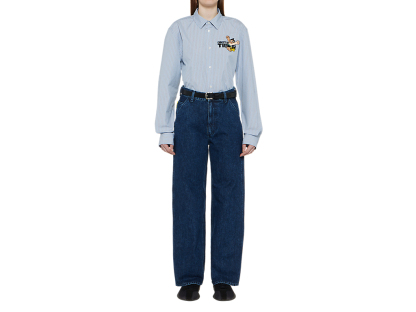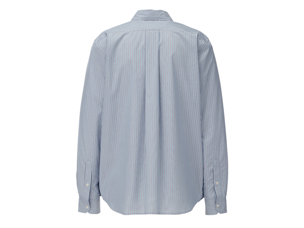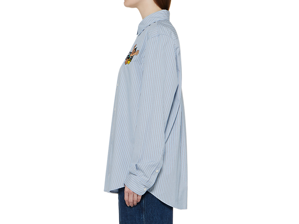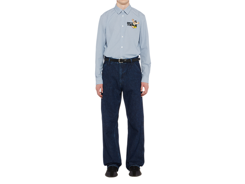 シンプルでクラシックなストライプ柄のシャツ。左胸には、鉄腕アトムとブランドロゴが組み合わさった刺繍が施されており、アトムの赤いブーツがブランドのアイコニックカラーのタイガーイエローに。