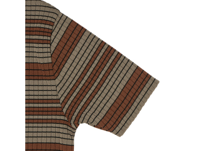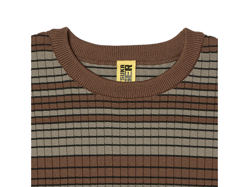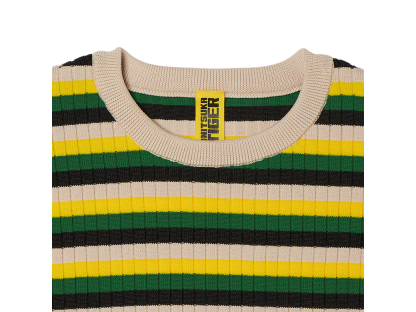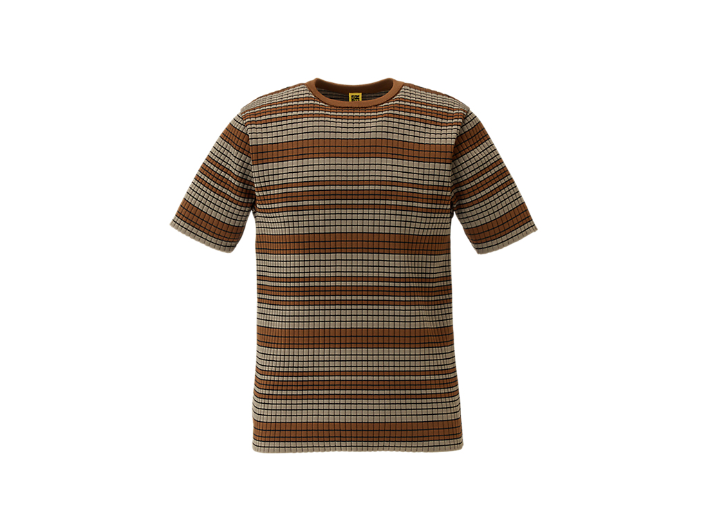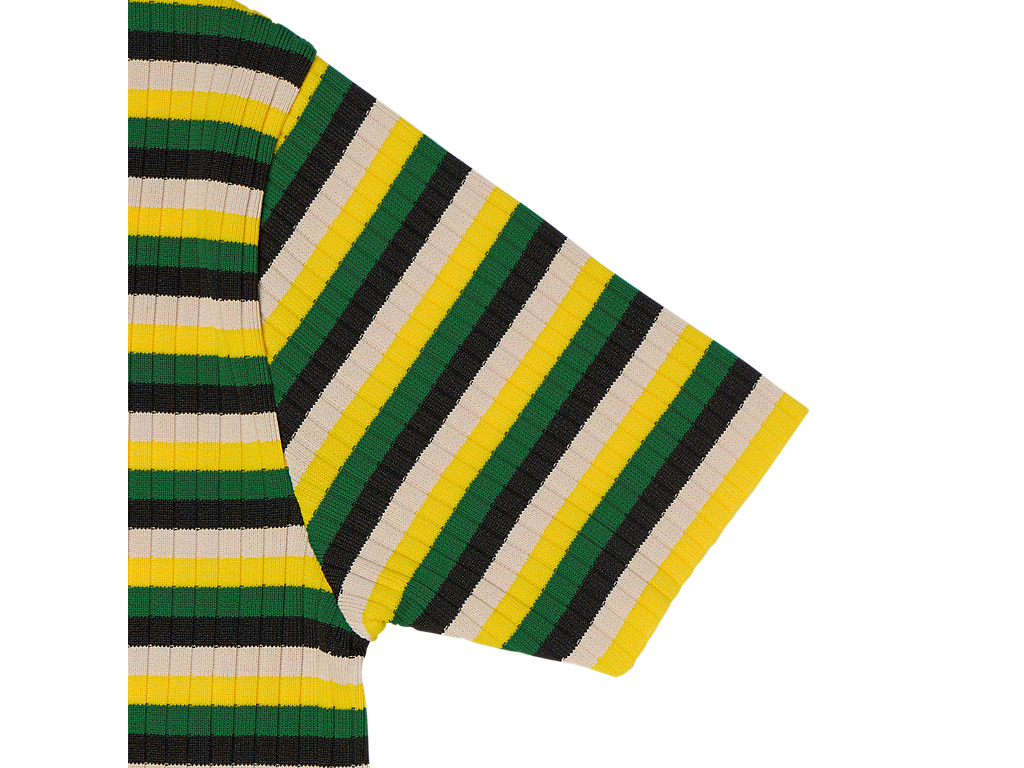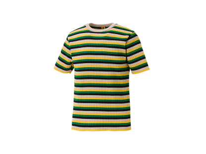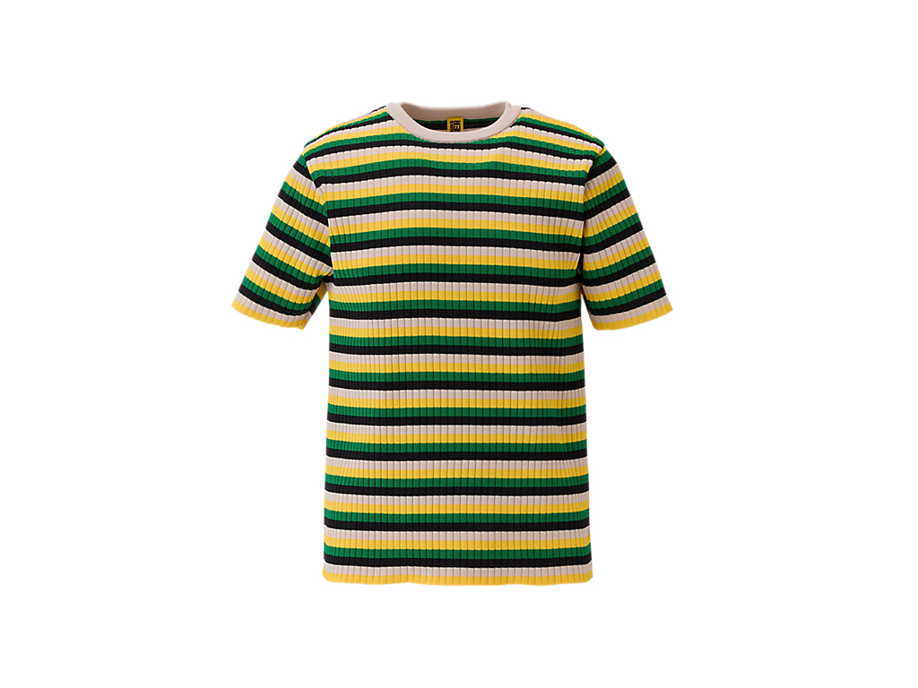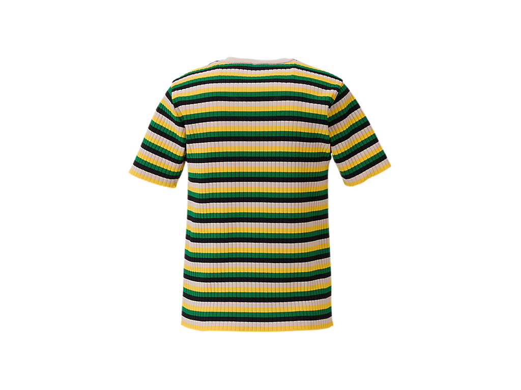 軽量で通気性の良いポリエステル繊維を使用した「SHORT SLEEVED KNIT TOP」は、快適さとスタイルを兼ね備えた一着です。マルチカラーのストライプが目を引き、街中でも一際目立つインパクトのあるデザインです。タイトフィットのシルエットは、体のラインを美しく引き立て、モダンで洗練された印象を与えます。