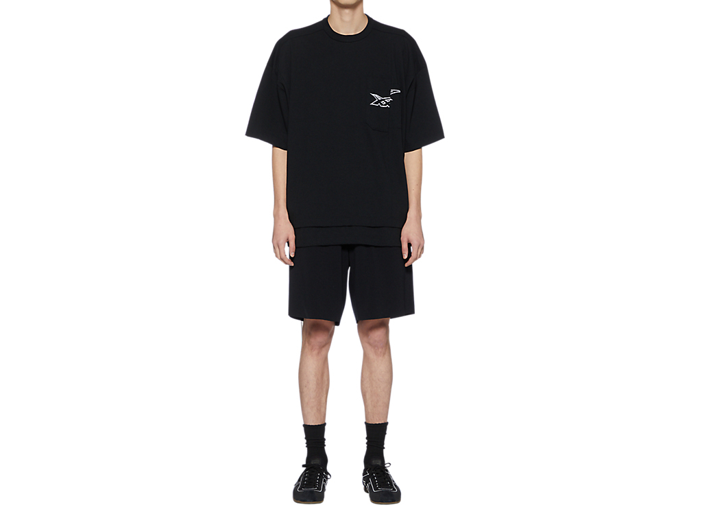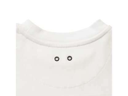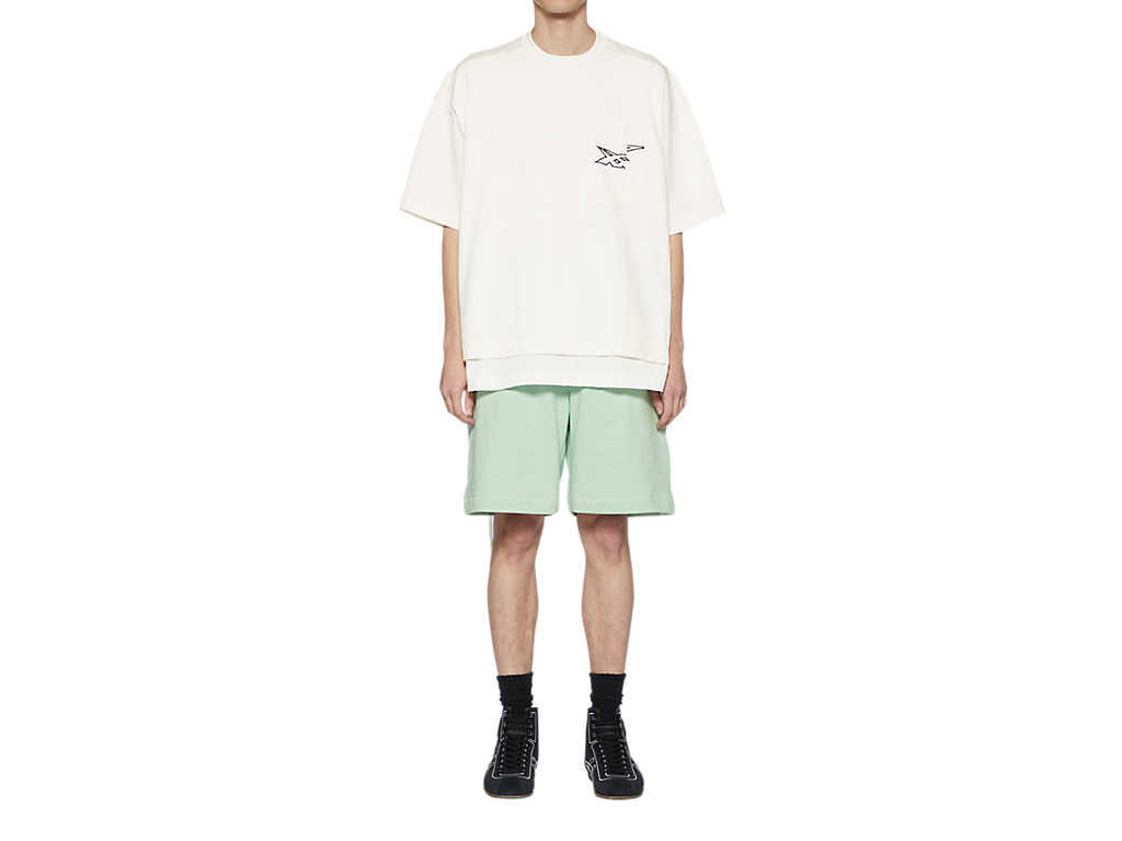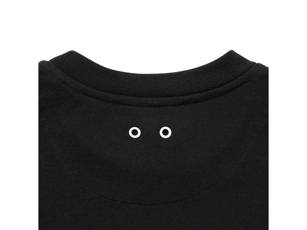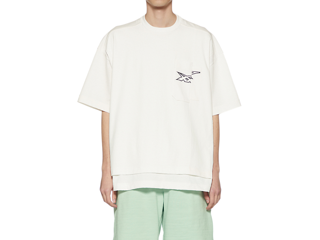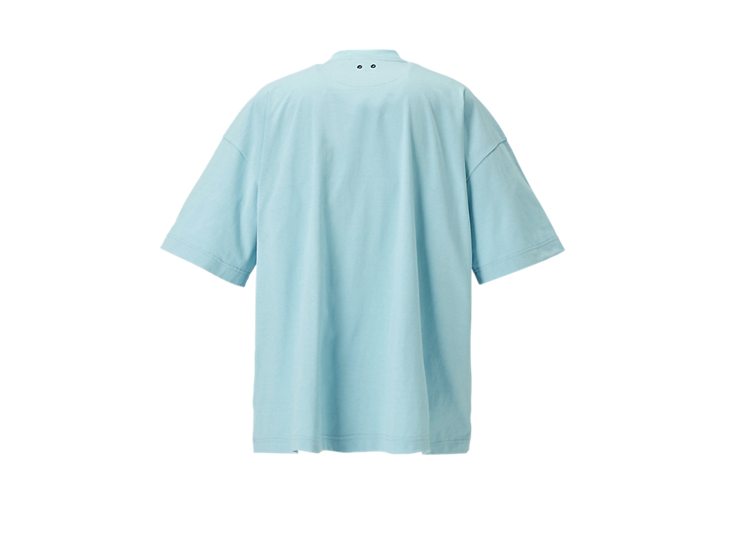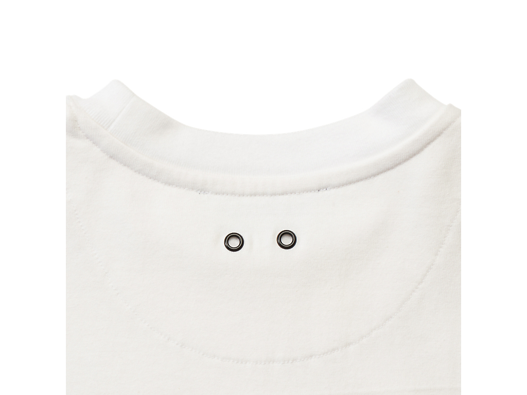 ほどよい厚みの糸を使用し、ソフトな着心地に仕上げている。左胸のポケットは2つのパーツに切り替えられており、ずらしたジグザグステッチのクロウストライプが絶妙なアクセントに。また、バックの首元にはアイレットを配し、2023年春夏コレクションのディテールを落とし込んでいる。