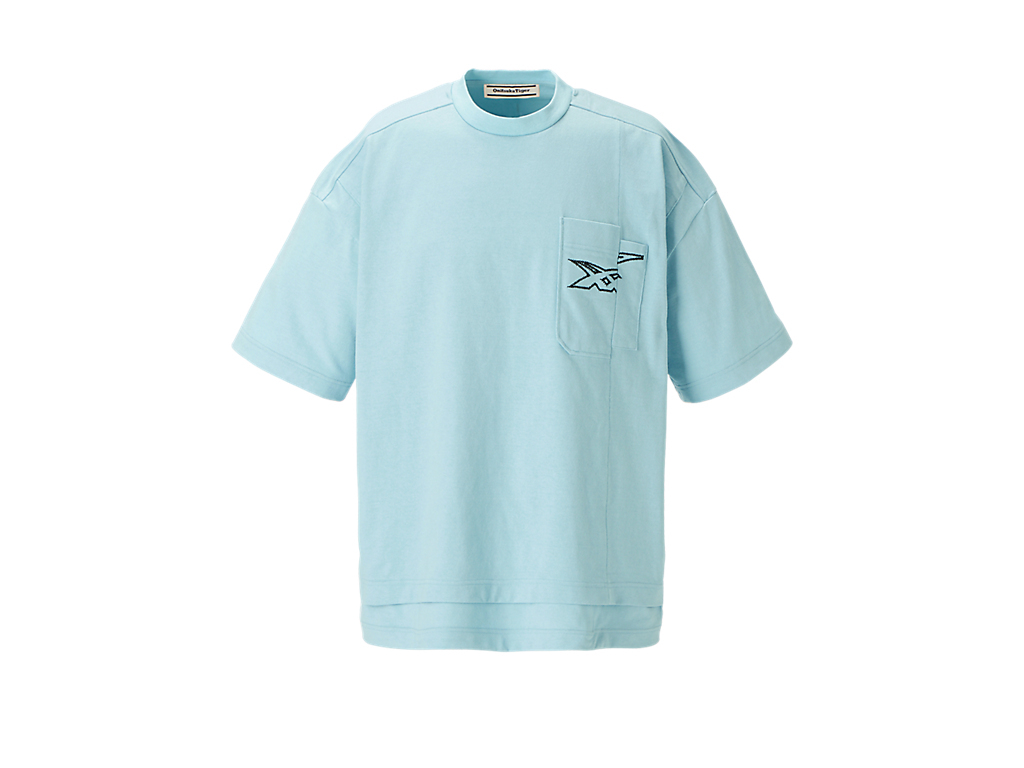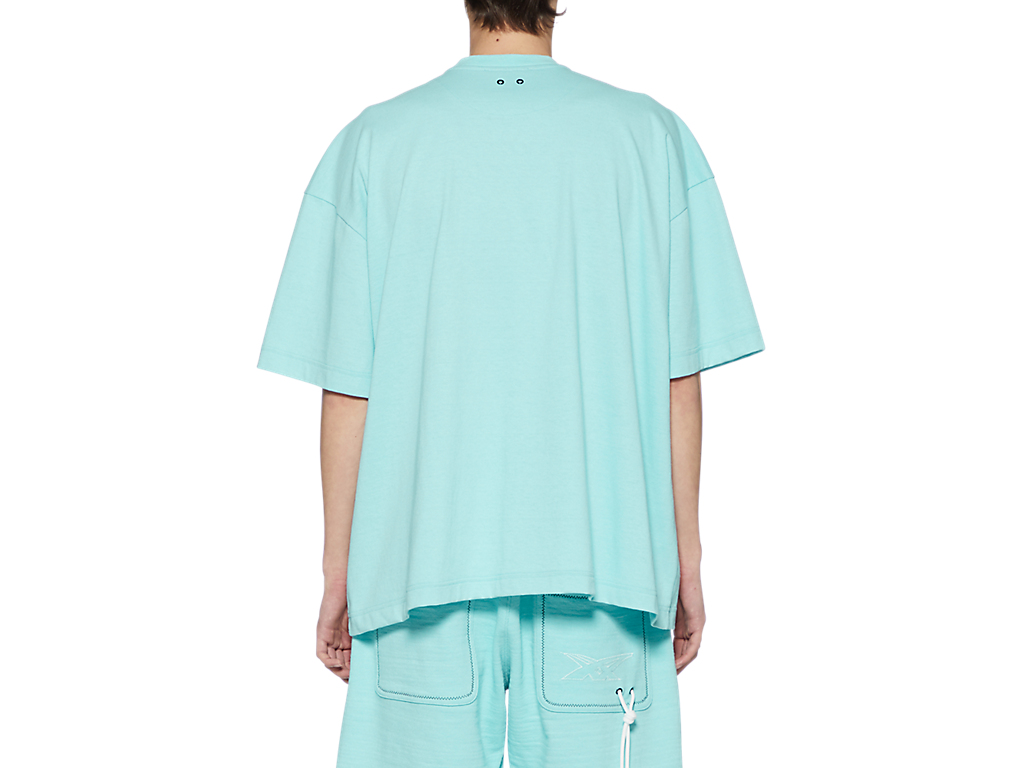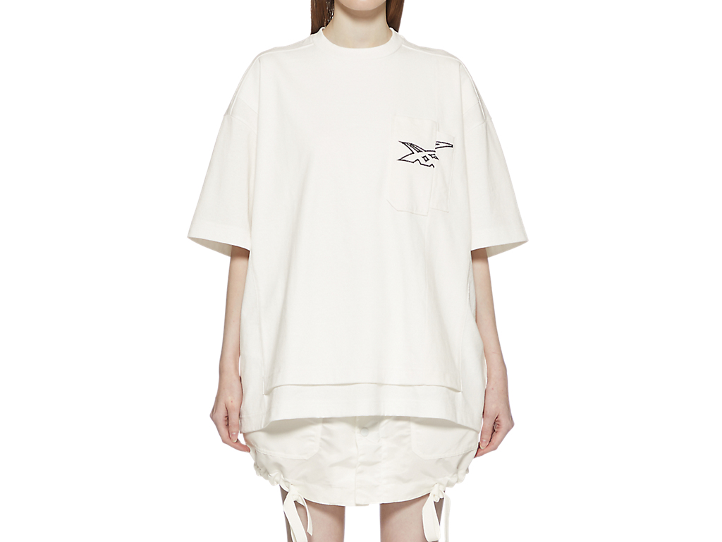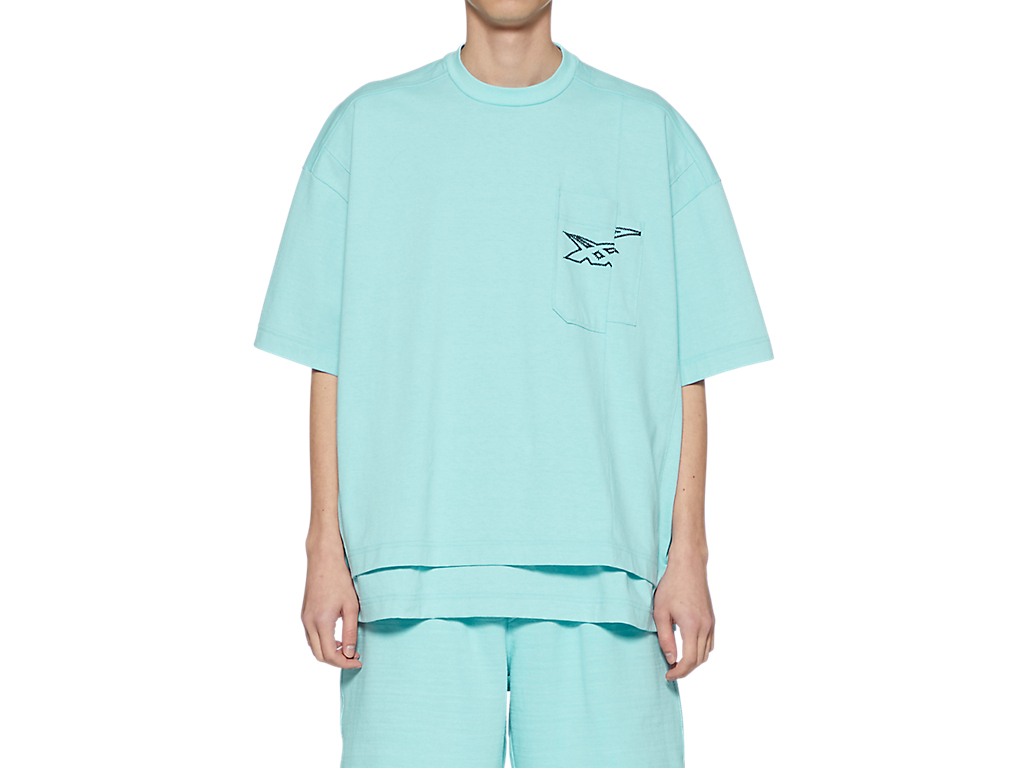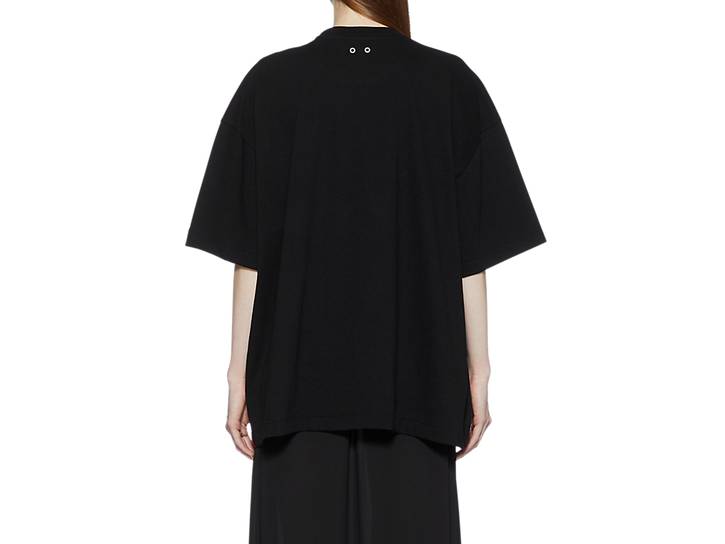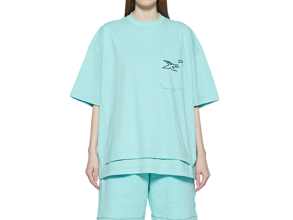 ほどよい厚みの糸を使用し、ソフトな着心地に仕上げている。左胸のポケットは2つのパーツに切り替えられており、ずらしたジグザグステッチのクロウストライプが絶妙なアクセントに。また、バックの首元にはアイレットを配し、2023年春夏コレクションのディテールを落とし込んでいる。