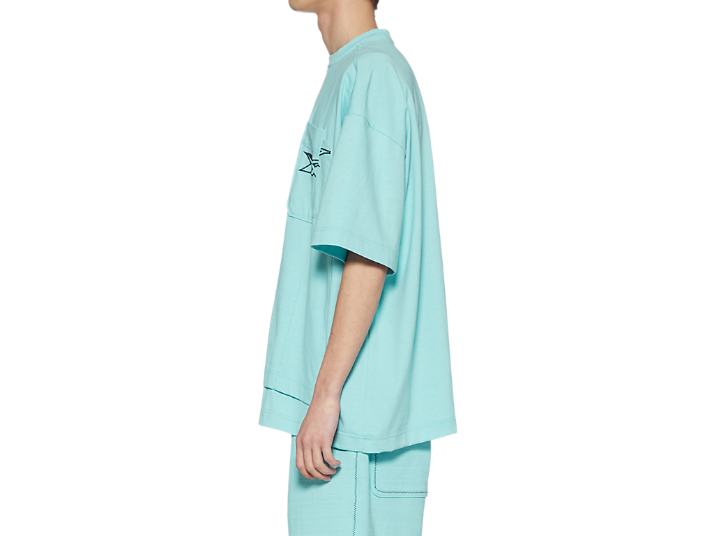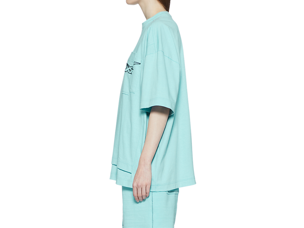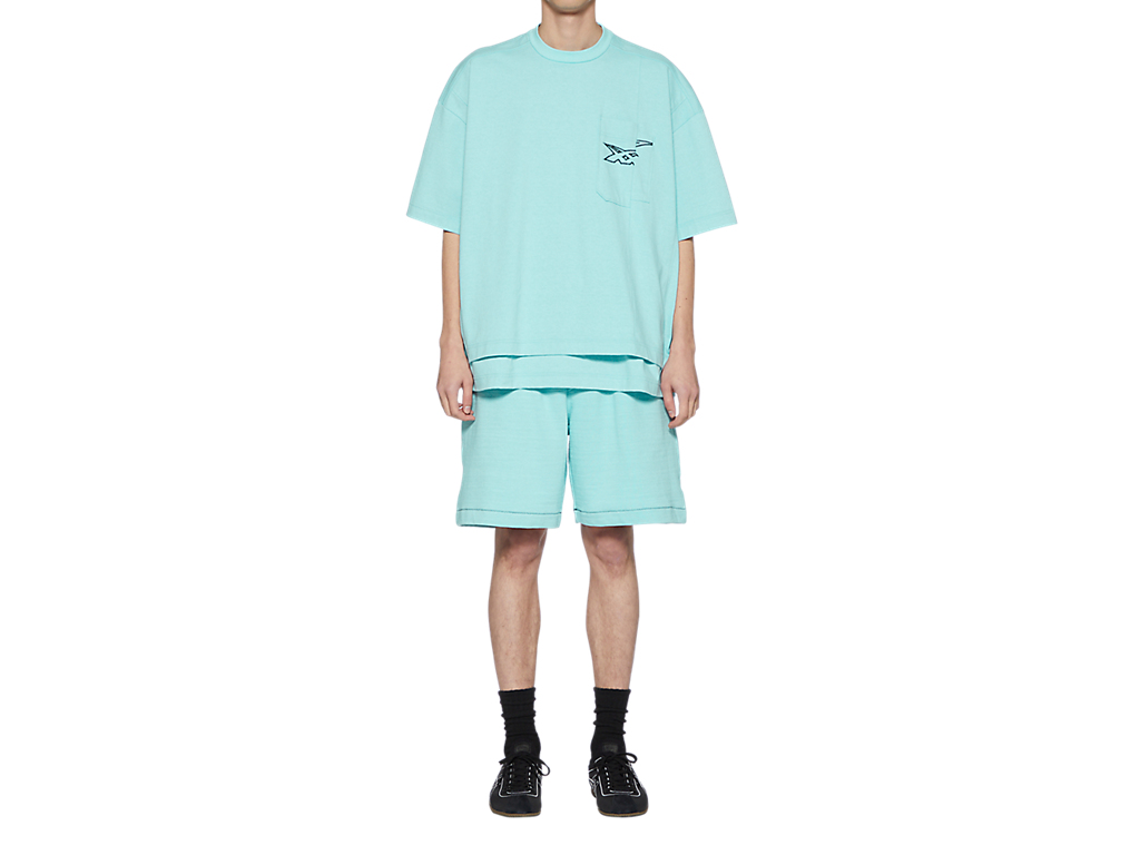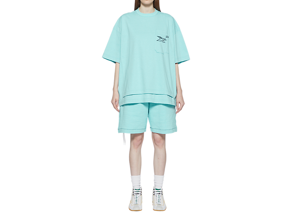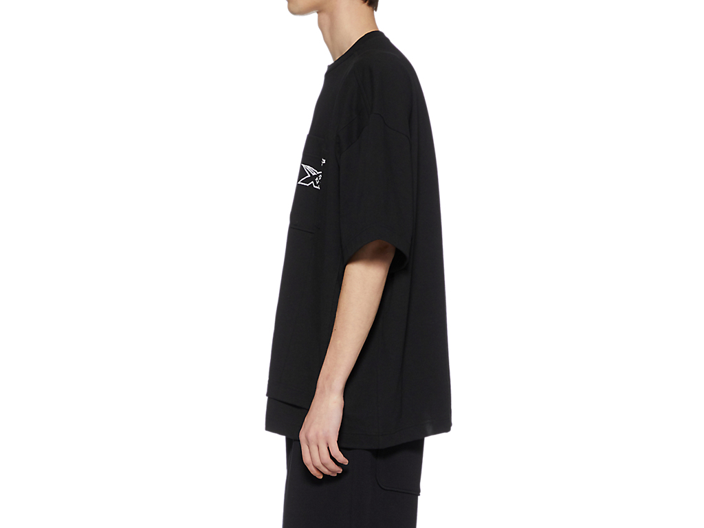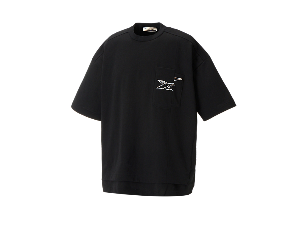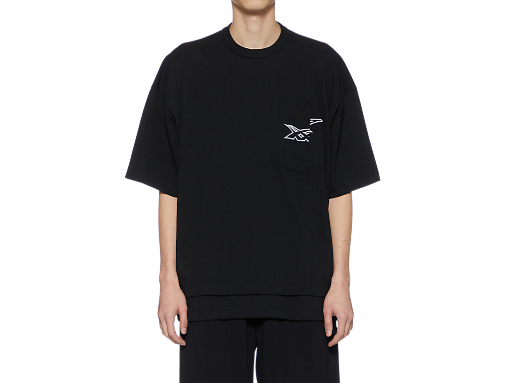 ほどよい厚みの糸を使用し、ソフトな着心地に仕上げている。左胸のポケットは2つのパーツに切り替えられており、ずらしたジグザグステッチのクロウストライプが絶妙なアクセントに。また、バックの首元にはアイレットを配し、2023年春夏コレクションのディテールを落とし込んでいる。