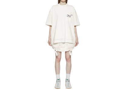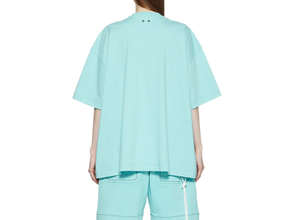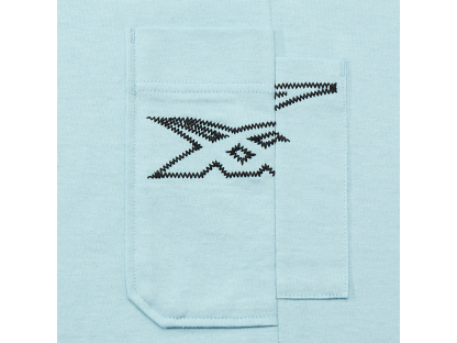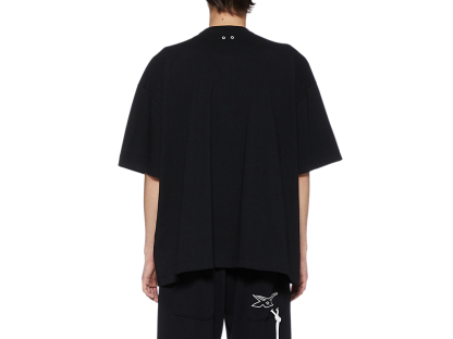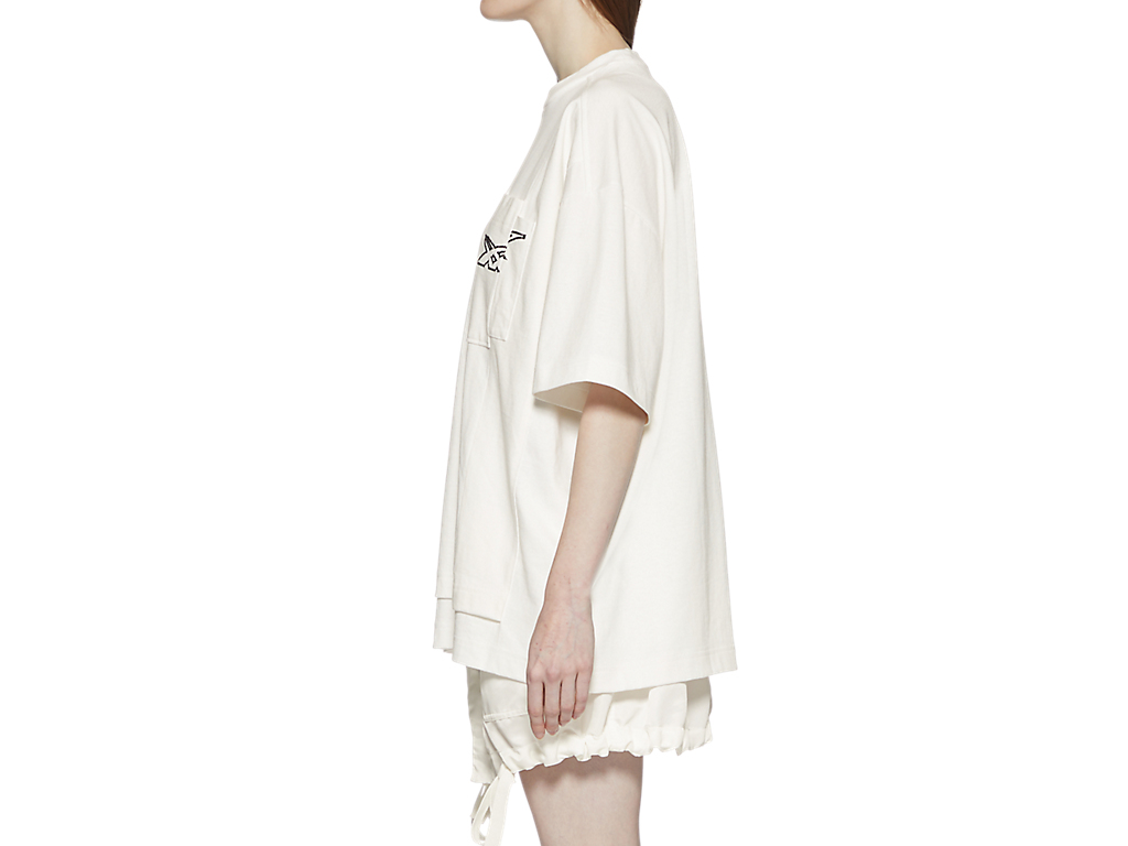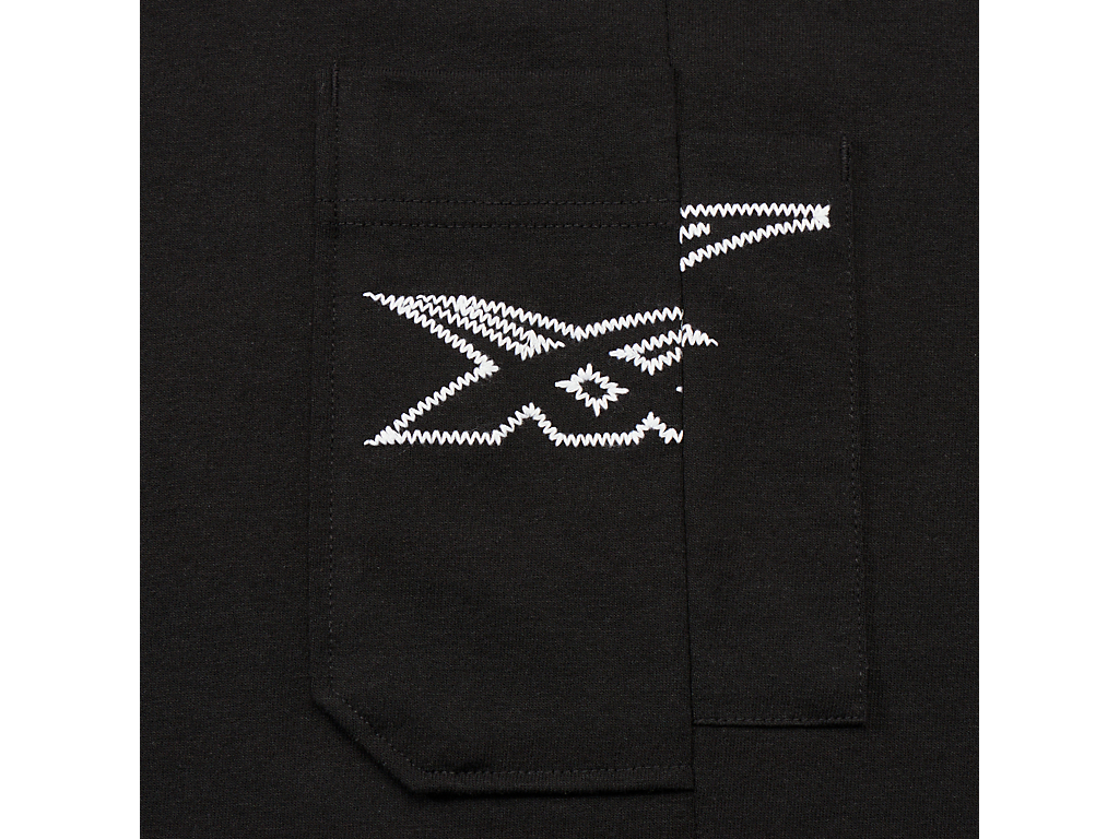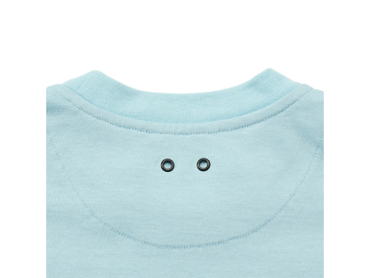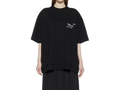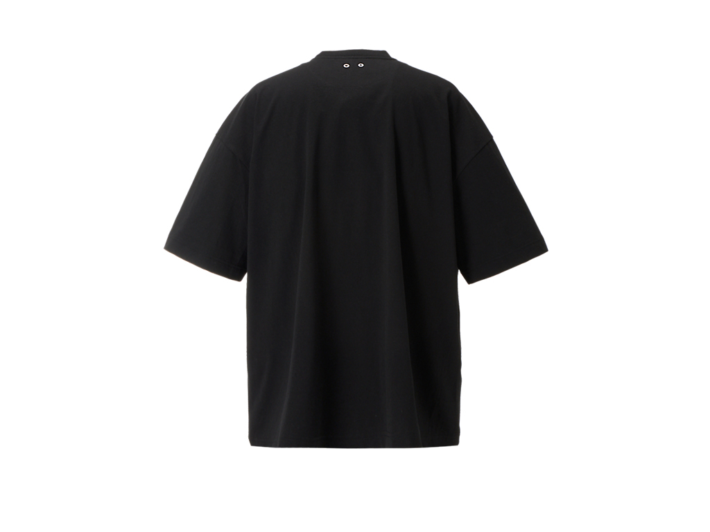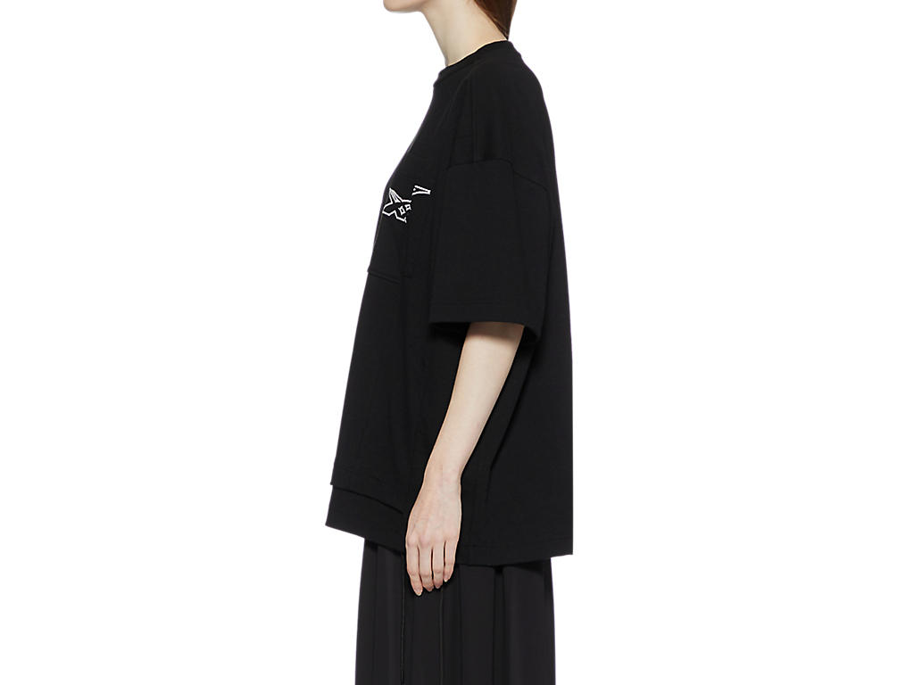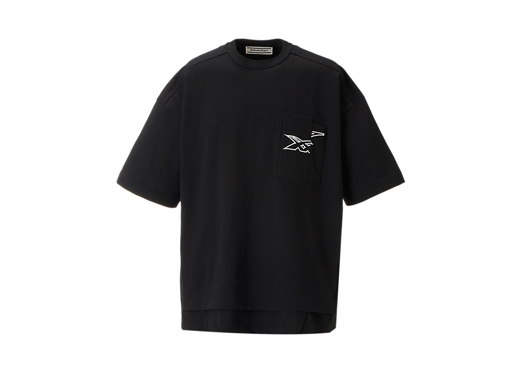 ほどよい厚みの糸を使用し、ソフトな着心地に仕上げている。左胸のポケットは2つのパーツに切り替えられており、ずらしたジグザグステッチのクロウストライプが絶妙なアクセントに。また、バックの首元にはアイレットを配し、2023年春夏コレクションのディテールを落とし込んでいる。