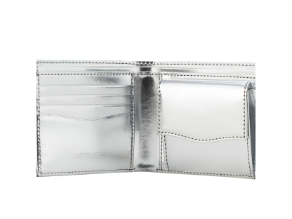 世界的なブランドである"神戸牛"の革を使った二つ折りウォレット。使われている革は姫路のタンナーが仕立てたガラスレザーにイタリア製の綺麗なミラー箔を乗せ高級感を高めた革です。サイズはポケットに収まりやすい大きさにし、内部には使い勝手がよいようにコインケースとカードケースを配置してあります。