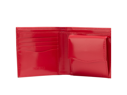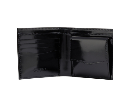 世界的なブランドである"神戸牛"の革を使った二つ折りウォレット。使われている革は姫路のタンナーが適度なしなやかさを残しつつガラスレザーに仕立てました。サイズはポケットに収まりがよい大きさし、内部には使い勝手がよいようにコインケースとカードケースを配置してあります。