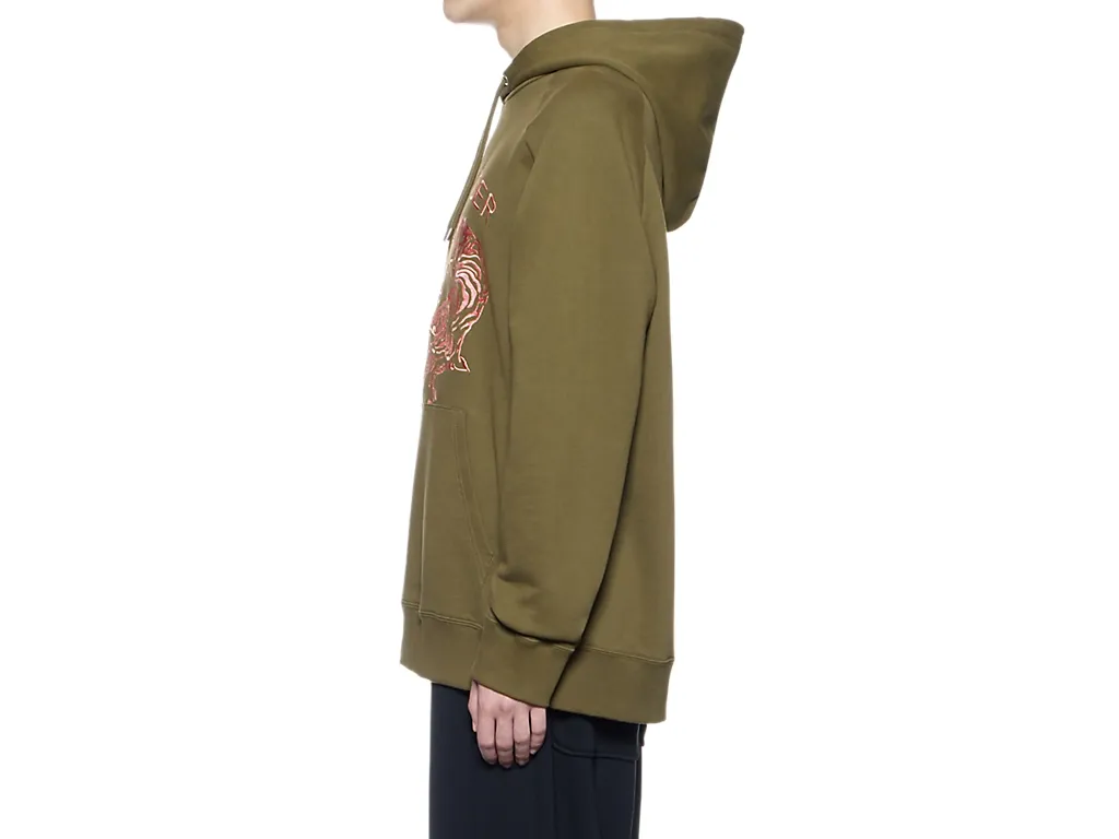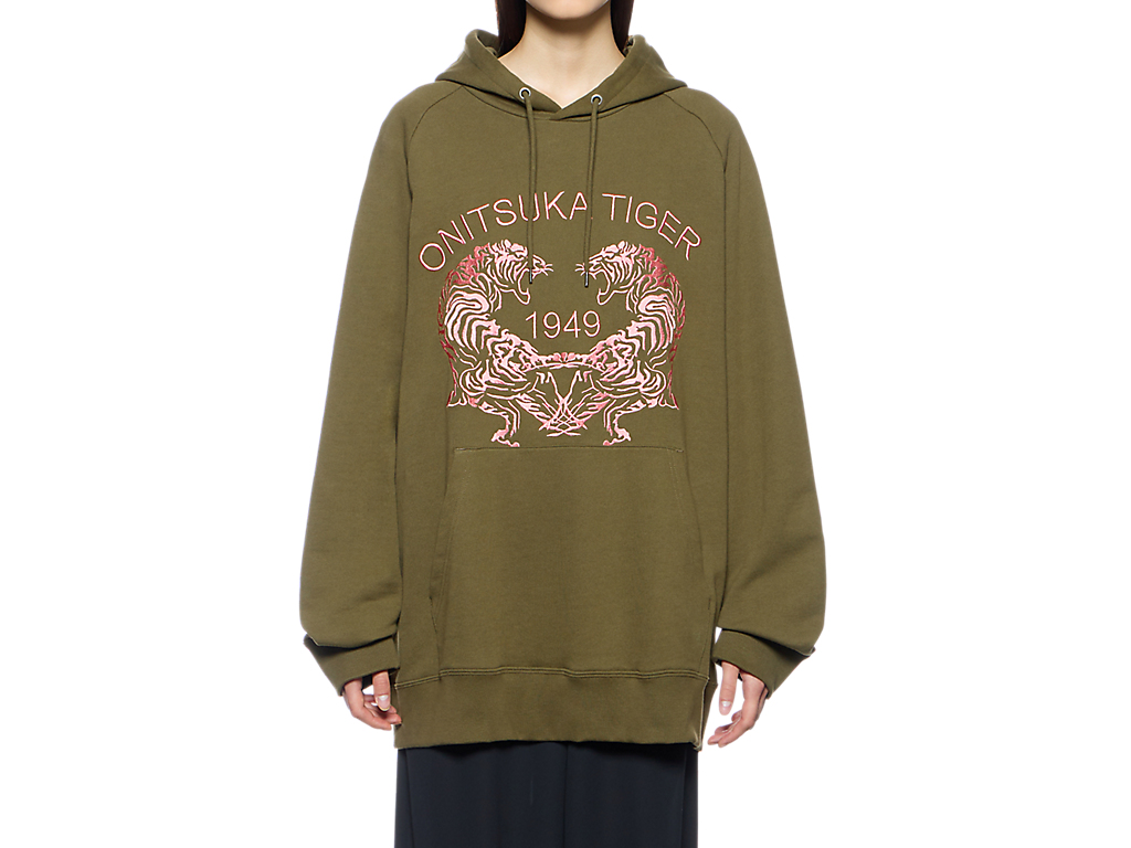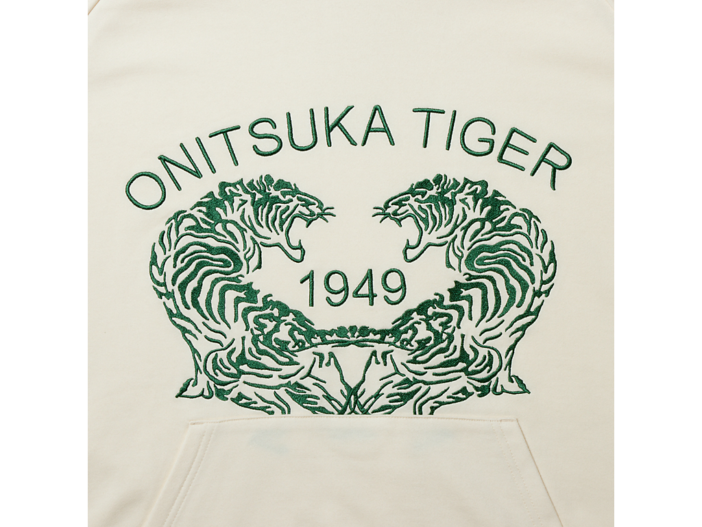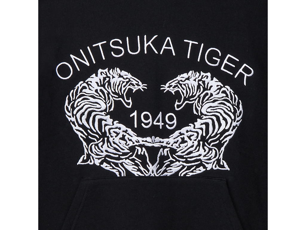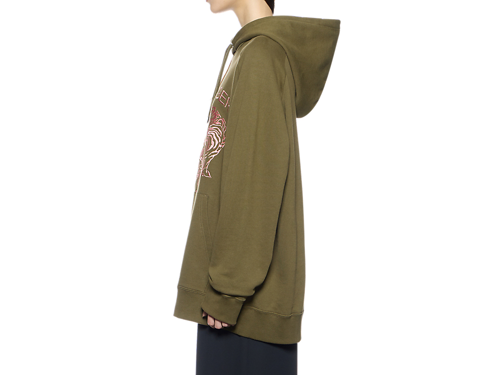 2体組み合わせた見返り虎のグラフィックを刺繍で表現したスウェットフーディー。