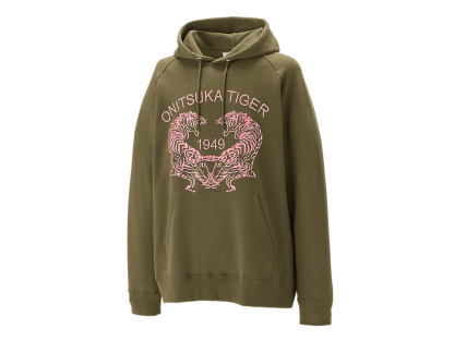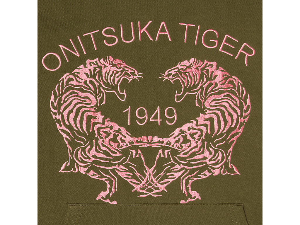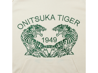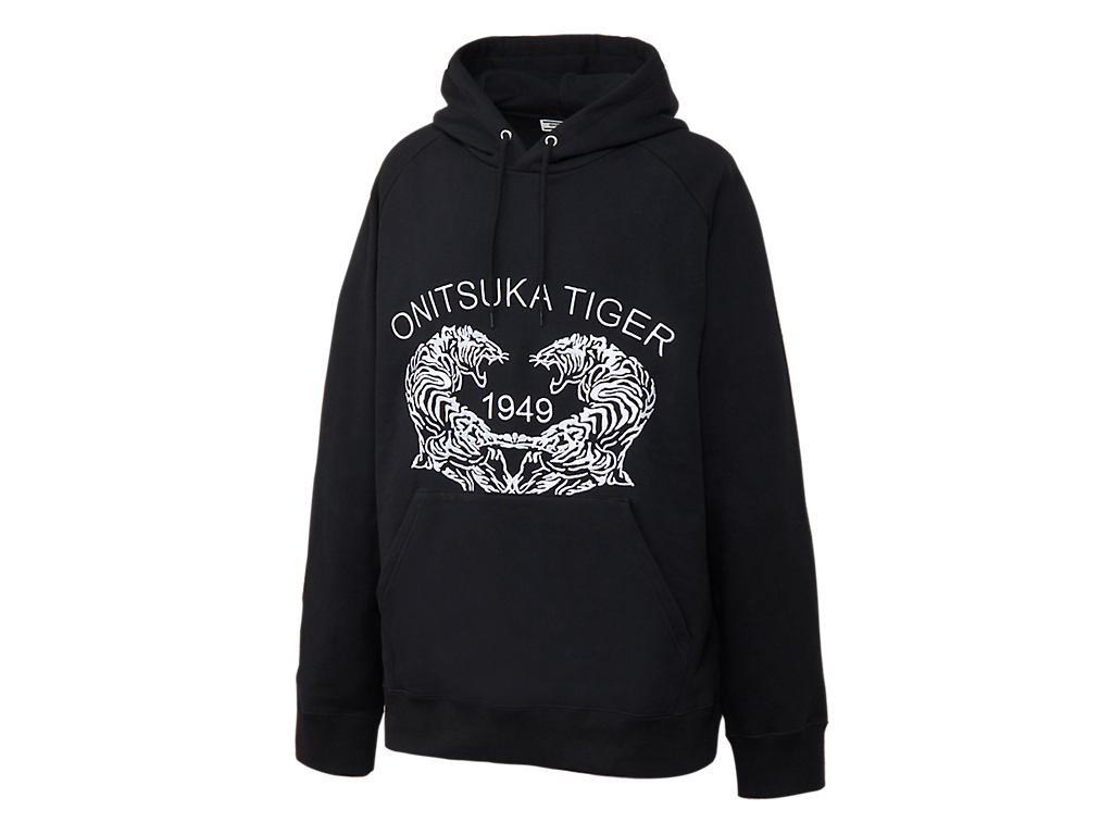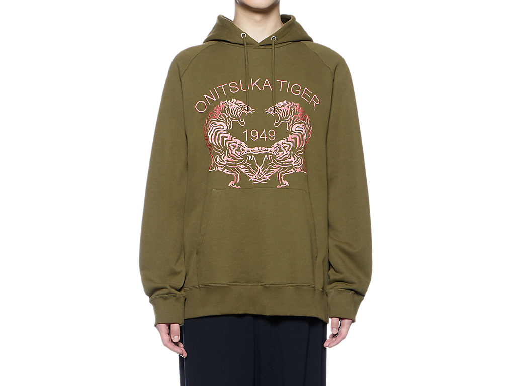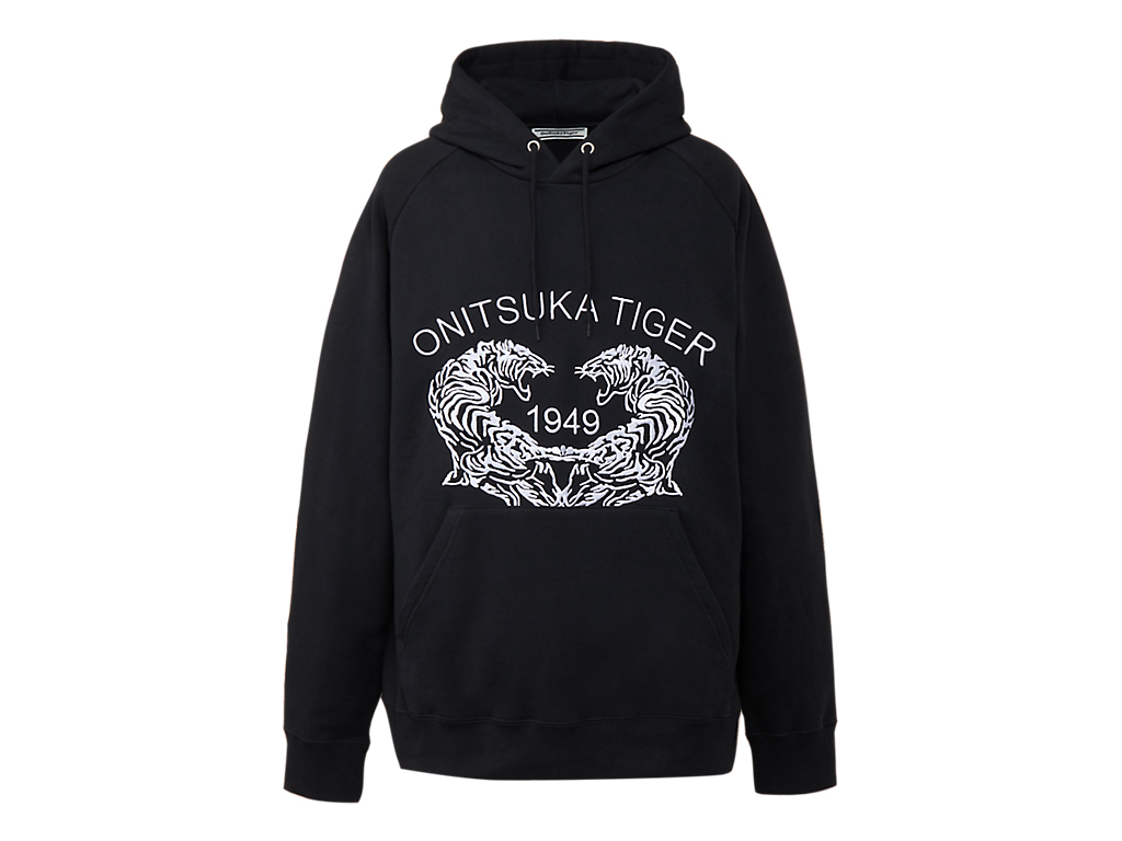 2体組み合わせた見返り虎のグラフィックを刺繍で表現したスウェットフーディー。