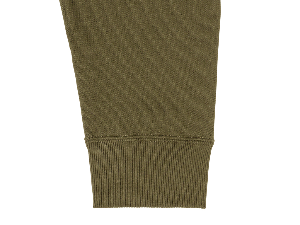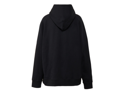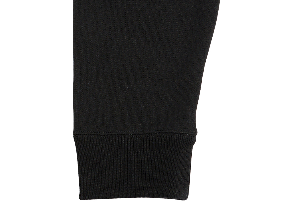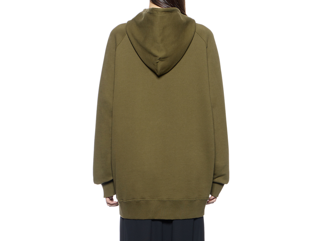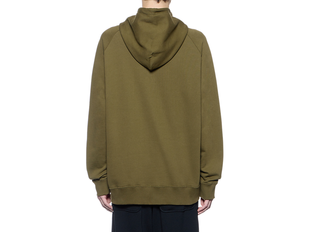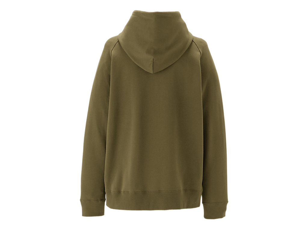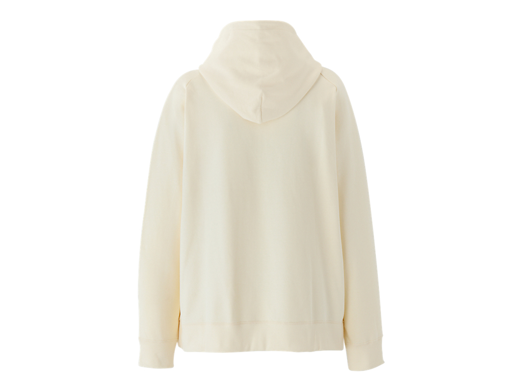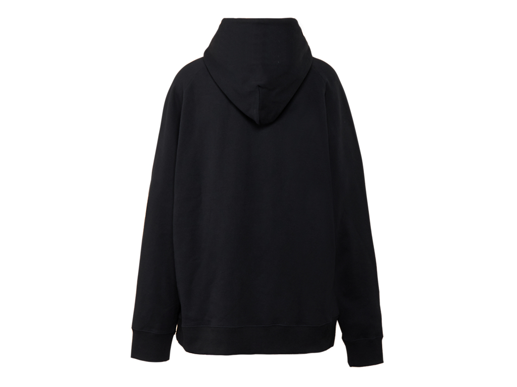 フロントのフードを重ねたデザインや、あえてポケットと重なるよう配された刺繍の位置など、随所にこだわりが光る。綿100%のほどよい厚みの裏毛生地を使用している。