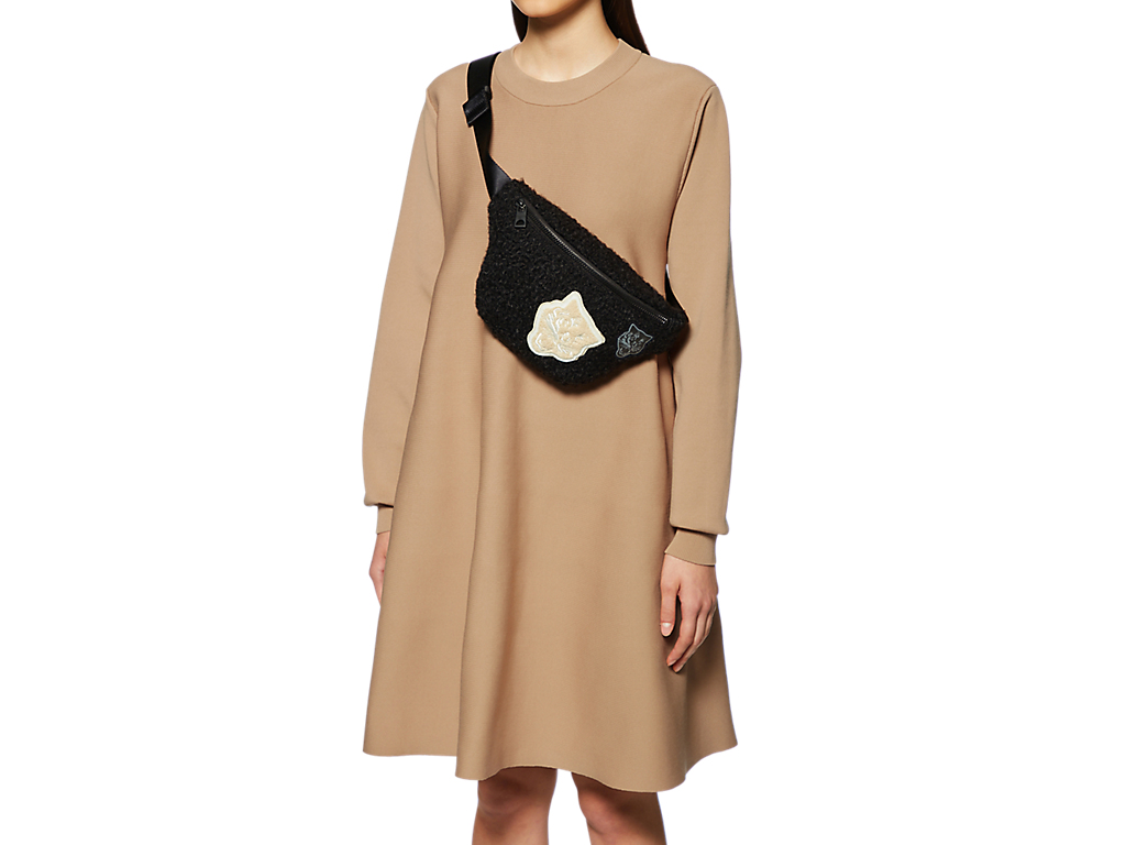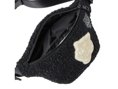 独特の風合いを楽しめるサガラ刺繍ワッペンとエンボスワッペンとの異なる素材を使用し、わざとずらした配置に。毛足が長めのボアを使用し、コーディネートのアクセントになるアイテム。肩から斜めがけも可能で、ちょっとした外出用におすすめ。