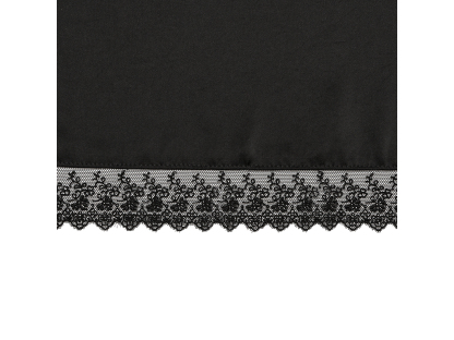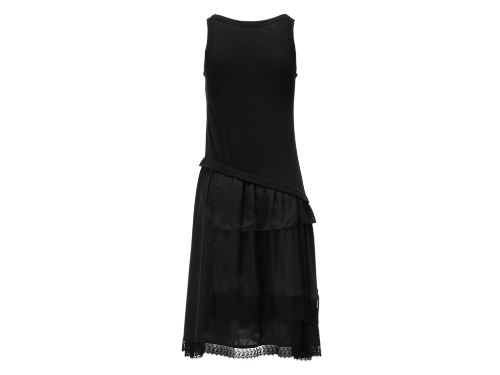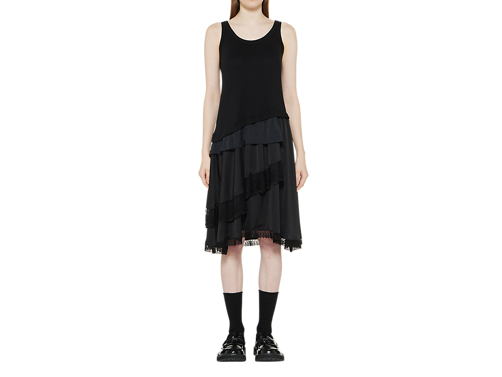 トップにはジャージ素材を、スカートには布帛とレースを不規則にレイヤードし仕立てました。