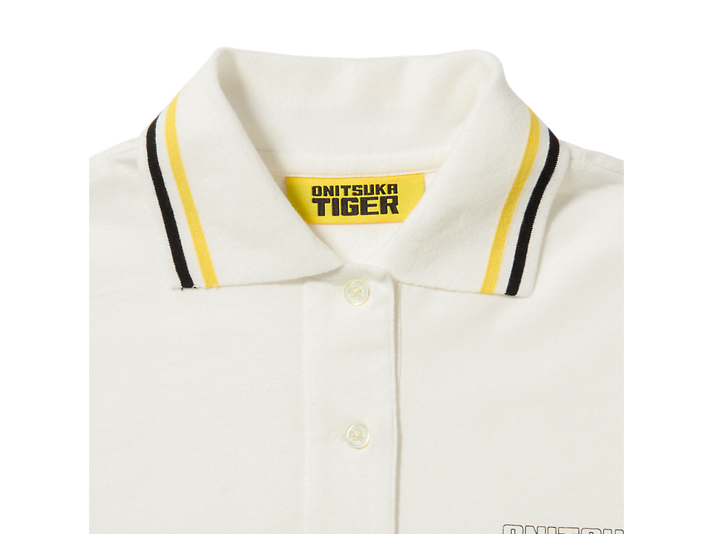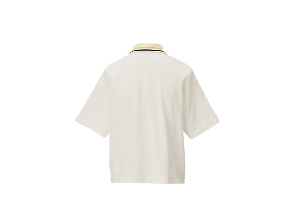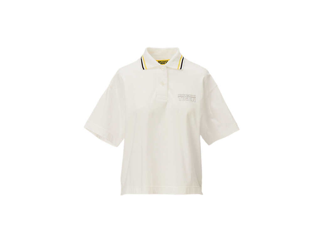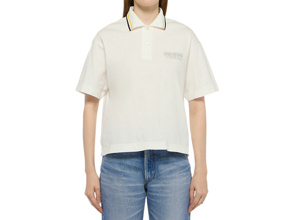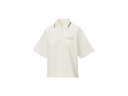 襟元のストライプと左胸のブランドロゴが特徴のショート丈のウィメンズポロシャツ。やわらかな着心地とシンプルながらも洗練されたデザインで、さまざまなスタイリングを楽しめる。
