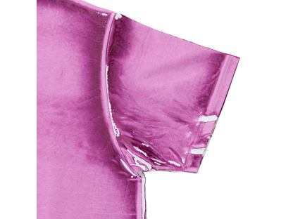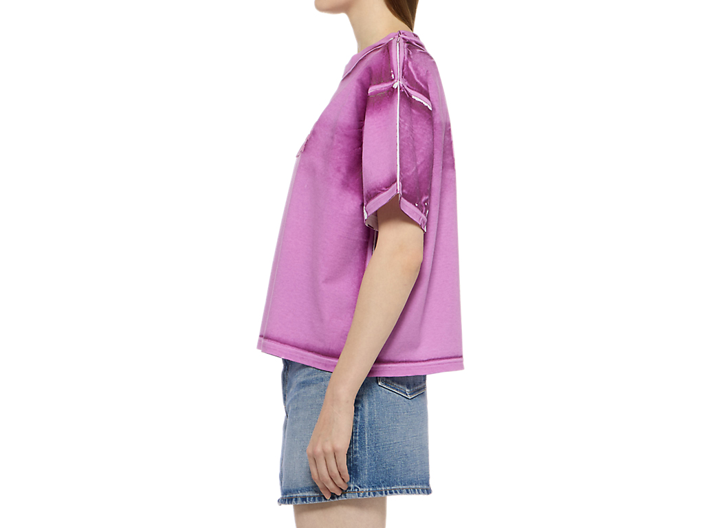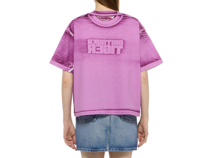 手作業で製品プリントを施したショート丈のTシャツ。独特な風合いと一点一点異なる個性が魅力。