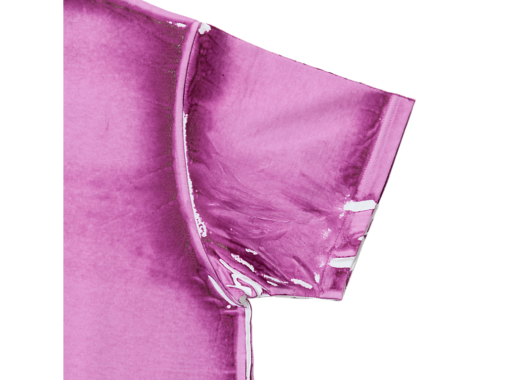 ホワイトのベース生地にブランドロゴのパッチを縫い付けた後、一枚一枚丁寧に製品プリントを施し、背中にロゴが反転したような独特な表情を生み出す。